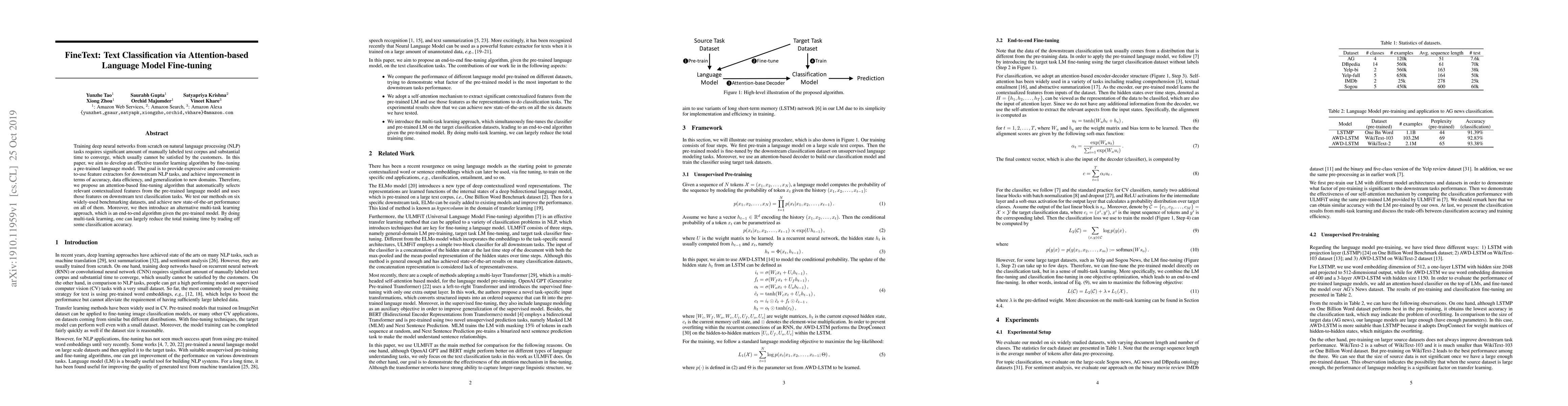 This paper proposes an attention-based fine-tuning algorithm to efficiently transfer knowledge from a pre-trained language model for text classification, achieving state-of-the-art performance on six datasets. It also introduces a multi-task learning approach to further reduce training time at the cost of some accuracy.