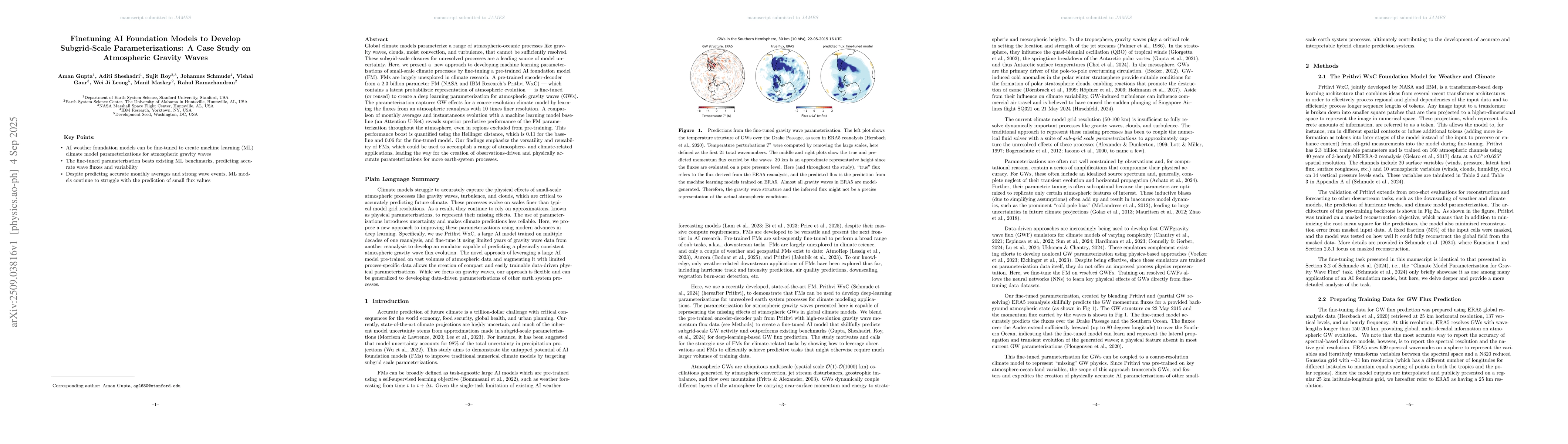 Global climate models parameterize a range of atmospheric-oceanic processes like gravity waves, clouds, moist convection, and turbulence that cannot be sufficiently resolved. These subgrid-scale closures for unresolved processes are a leading source of model uncertainty. Here, we present a new approach to developing machine learning parameterizations of small-scale climate processes by fine-tuning a pre-trained AI foundation model (FM). FMs are largely unexplored in climate research. A pre-trained encoder-decoder from a 2.3 billion parameter FM (NASA and IBM Research's Prithvi WxC) -- which contains a latent probabilistic representation of atmospheric evolution -- is fine-tuned (or reused) to create a deep learning parameterization for atmospheric gravity waves (GWs). The parameterization captures GW effects for a coarse-resolution climate model by learning the fluxes from an atmospheric reanalysis with 10 times finer resolution. A comparison of monthly averages and instantaneous evolution with a machine learning model baseline (an Attention U-Net) reveals superior predictive performance of the FM parameterization throughout the atmosphere, even in regions excluded from pre-training. This performance boost is quantified using the Hellinger distance, which is 0.11 for the baseline and 0.06 for the fine-tuned model. Our findings emphasize the versatility and reusability of FMs, which could be used to accomplish a range of atmosphere- and climate-related applications, leading the way for the creation of observations-driven and physically accurate parameterizations for more earth-system processes.