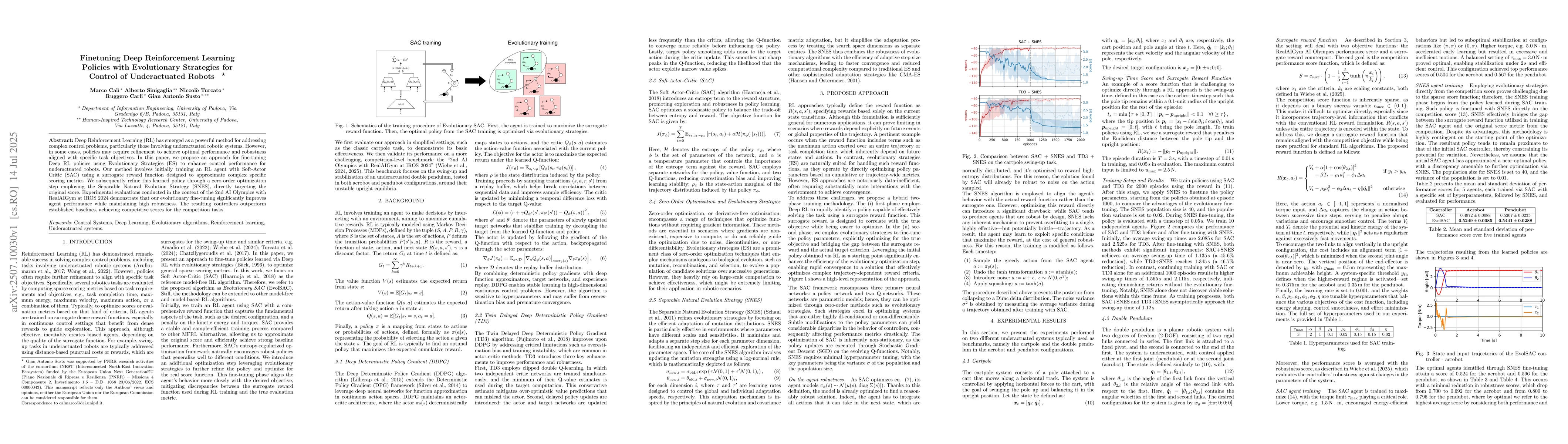 This paper presents a method to enhance Deep Reinforcement Learning (RL) policies for controlling underactuated robots using Evolutionary Strategies (ES). Initially, an RL agent is trained with Soft-Actor Critic (SAC) using a surrogate reward function. Then, the policy is refined with the Separable Natural Evolution Strategy (SNES) targeting original scoring metrics. Experiments show significant performance improvement and robustness compared to baseline methods in real-world robotic tasks.
