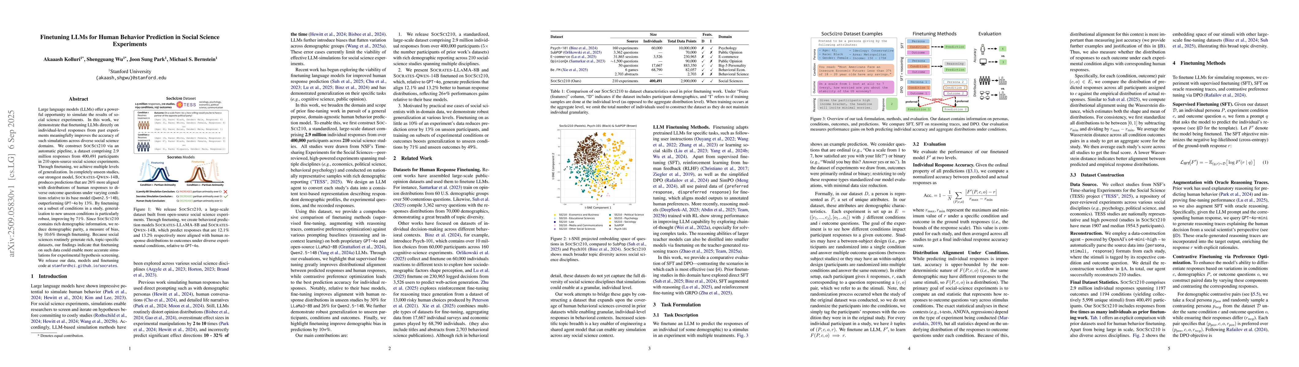 Large language models (LLMs) offer a powerful opportunity to simulate the results of social science experiments. In this work, we demonstrate that finetuning LLMs directly on individual-level responses from past experiments meaningfully improves the accuracy of such simulations across diverse social science domains. We construct SocSci210 via an automatic pipeline, a dataset comprising 2.9 million responses from 400,491 participants in 210 open-source social science experiments. Through finetuning, we achieve multiple levels of generalization. In completely unseen studies, our strongest model, Socrates-Qwen-14B, produces predictions that are 26% more aligned with distributions of human responses to diverse outcome questions under varying conditions relative to its base model (Qwen2.5-14B), outperforming GPT-4o by 13%. By finetuning on a subset of conditions in a study, generalization to new unseen conditions is particularly robust, improving by 71%. Since SocSci210 contains rich demographic information, we reduce demographic parity, a measure of bias, by 10.6% through finetuning. Because social sciences routinely generate rich, topic-specific datasets, our findings indicate that finetuning on such data could enable more accurate simulations for experimental hypothesis screening. We release our data, models and finetuning code at stanfordhci.github.io/socrates.