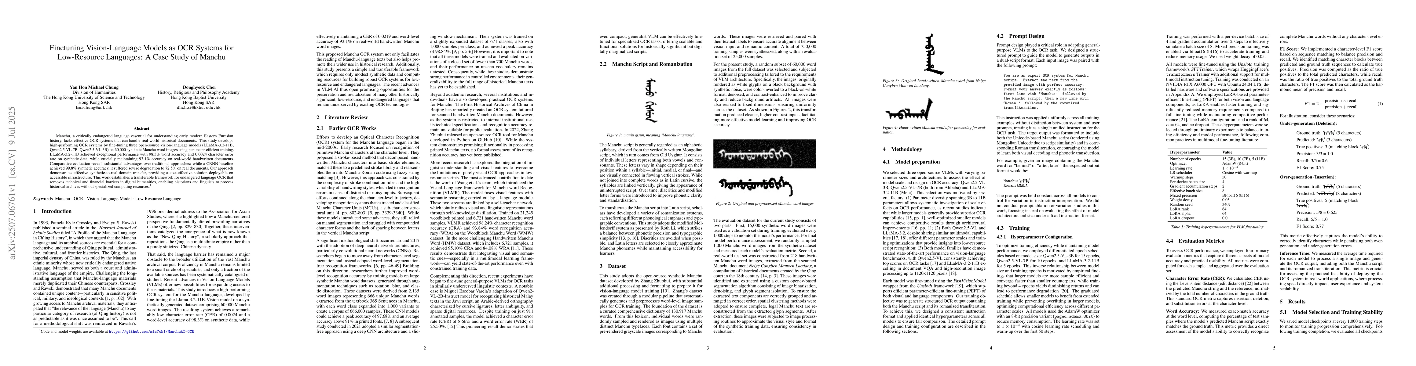 Manchu, a critically endangered language essential for understanding early modern Eastern Eurasian history, lacks effective OCR systems that can handle real-world historical documents. This study develops high-performing OCR systems by fine-tuning three open-source vision-language models (LLaMA-3.2-11B, Qwen2.5-VL-7B, Qwen2.5-VL-3B) on 60,000 synthetic Manchu word images using parameter-efficient training. LLaMA-3.2-11B achieved exceptional performance with 98.3\% word accuracy and 0.0024 character error rate on synthetic data, while crucially maintaining 93.1\% accuracy on real-world handwritten documents. Comparative evaluation reveals substantial advantages over traditional approaches: while a CRNN baseline achieved 99.8\% synthetic accuracy, it suffered severe degradation to 72.5\% on real documents. Our approach demonstrates effective synthetic-to-real domain transfer, providing a cost-effective solution deployable on accessible infrastructure. This work establishes a transferable framework for endangered language OCR that removes technical and financial barriers in digital humanities, enabling historians and linguists to process historical archives without specialized computing resources. Code and model weights are available at https://github.com/mic7ch1/ManchuAI-OCR.