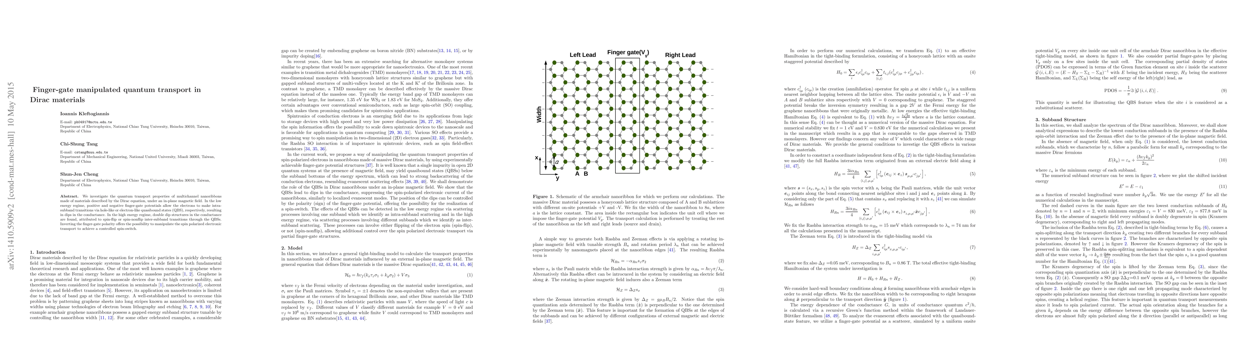 We investigate the quantum transport properties of multichannel nanoribbons made of materials described by the Dirac equation, under an in-plane magnetic field. In the low energy regime, positive and negative finger-gate potentials allow the electrons to make intra-subband transitions via hole-like or electron-like quasibound states (QBS), respectively, resulting in dips in the conductance. In the high energy regime, double dip structures in the conductance are found, attributed to spin-flip or spin-nonflip inter-subband transitions through the QBSs. Inverting the finger-gate polarity offers the possibility to manipulate the spin polarized electronic transport to achieve a controlled spin-switch.
