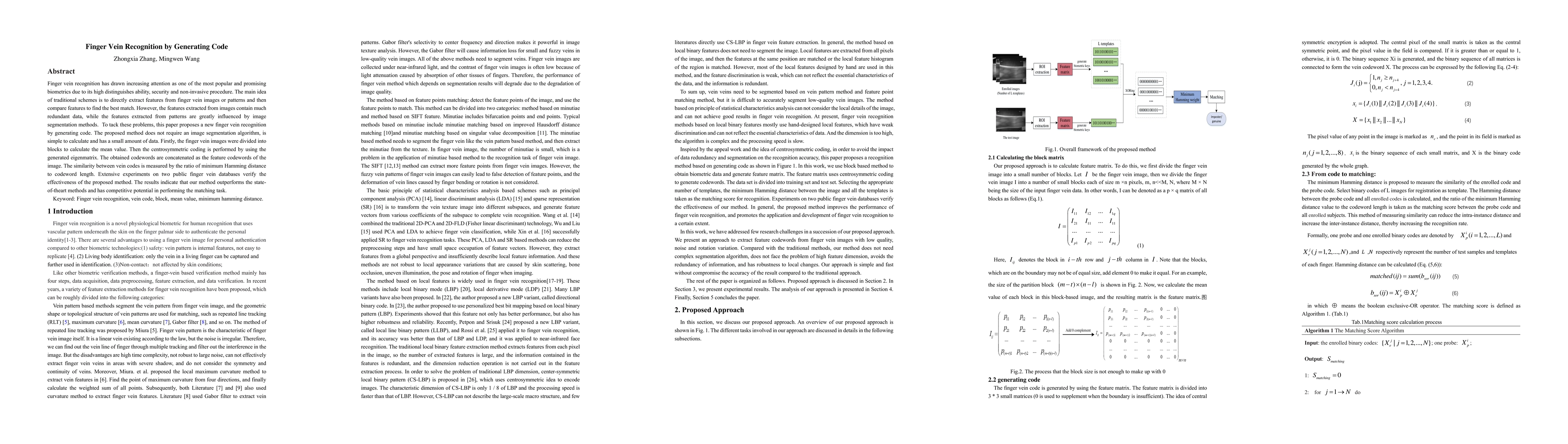This paper proposes a new method for finger vein recognition that generates a code from finger vein images without requiring segmentation, using mean value calculations and centrosymmetric coding. The method shows superior performance compared to state-of-the-art techniques in extensive experiments on public databases.