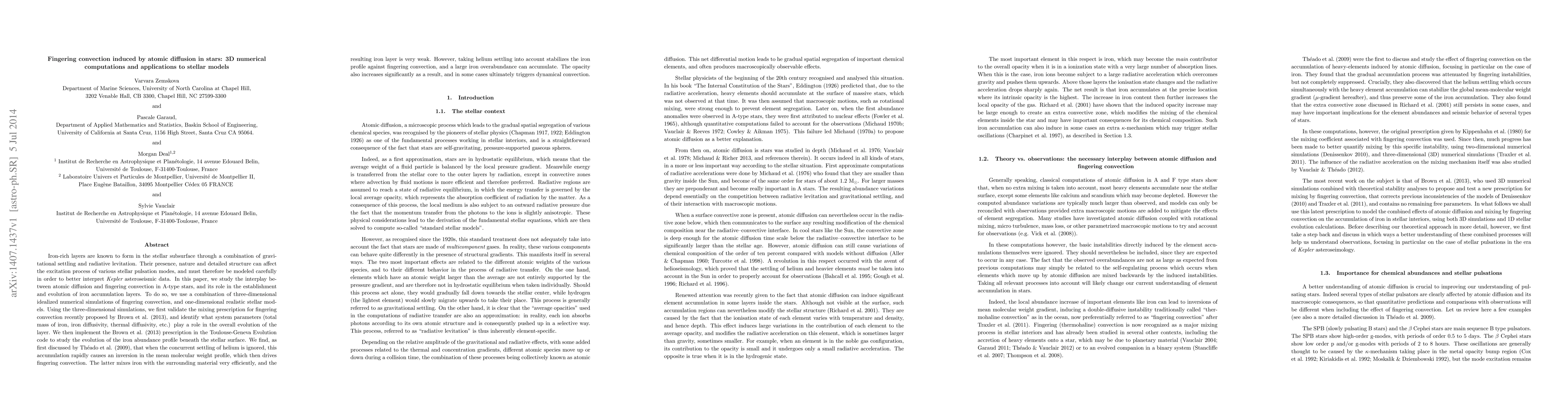 This paper investigates the interplay between atomic diffusion and fingering convection in A-type stars, focusing on the formation and evolution of iron-rich layers beneath the stellar surface. Using 3D simulations and stellar models, it finds that fingering convection efficiently mixes iron, but helium settling can stabilize the iron profile and lead to significant iron overabundance and increased opacity, potentially triggering dynamical convection.