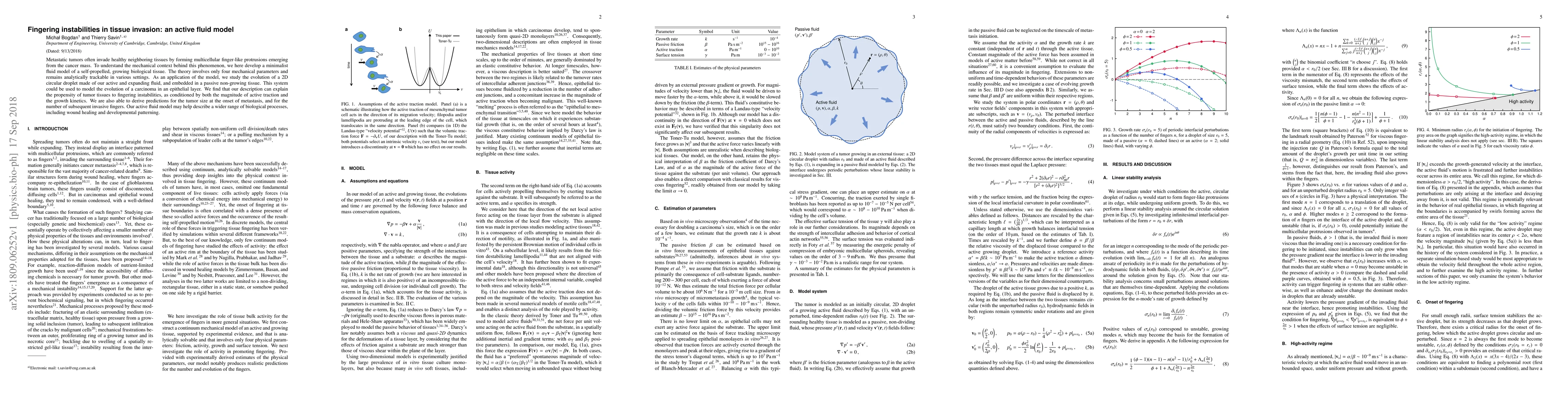 The paper develops an active fluid model to analyze the mechanical context of tumor tissue invasion, finding that fingering instabilities in metastatic tumors depend on active traction and growth kinetics, and predicting tumor size at metastasis onset and the number of invasive fingers. The model can also describe biological processes like wound healing and developmental patterning.