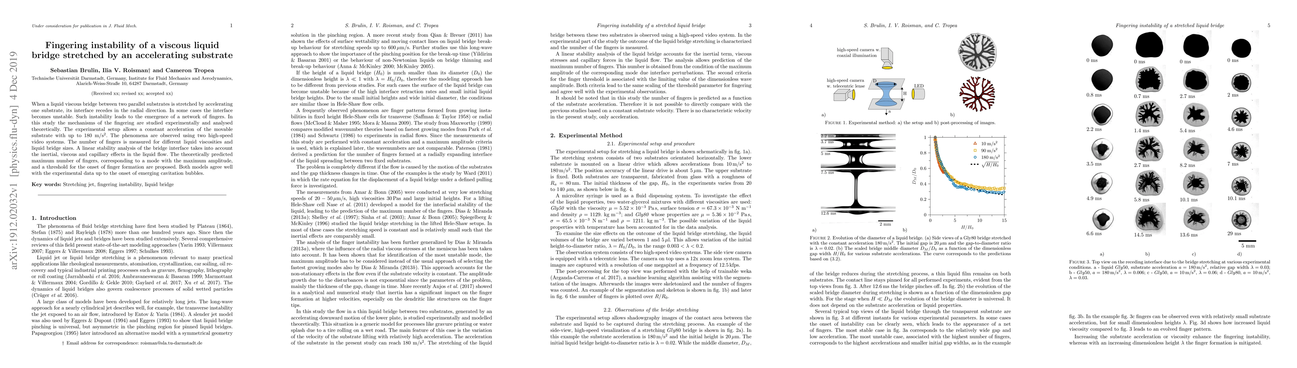 Researchers studied how a liquid bridge between two parallel substrates becomes unstable when stretched, forming a network of fingers, and found that theoretical models agree with experimental data up to the onset of cavitation bubbles.
