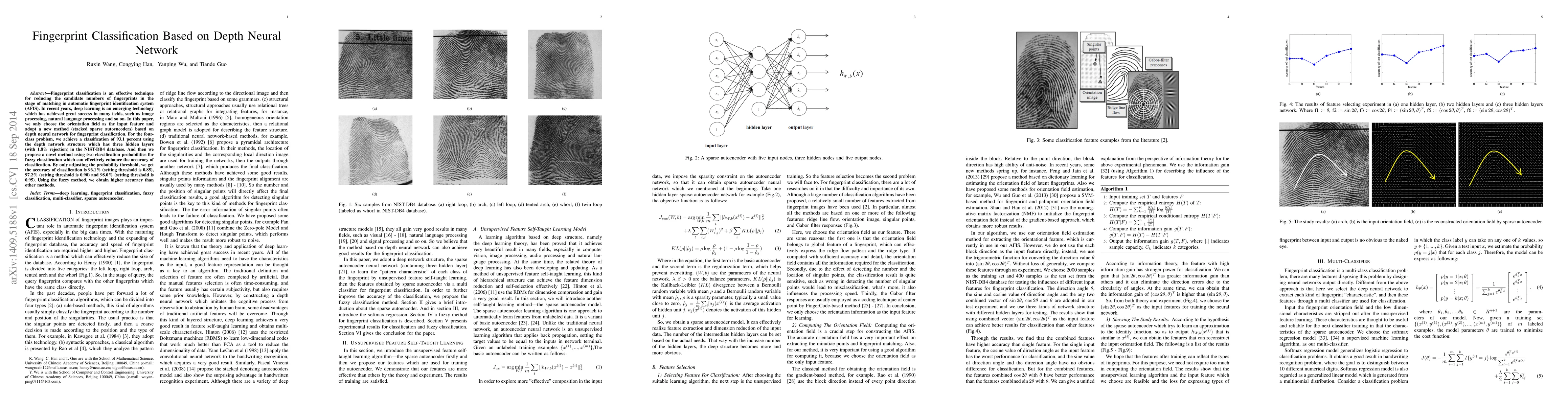 This paper proposes a depth neural network using stacked sparse autoencoders for fingerprint classification, achieving 93.1% accuracy on the NIST-DB4 dataset. A novel fuzzy classification method further enhances accuracy to 98.0% by adjusting classification probability thresholds.