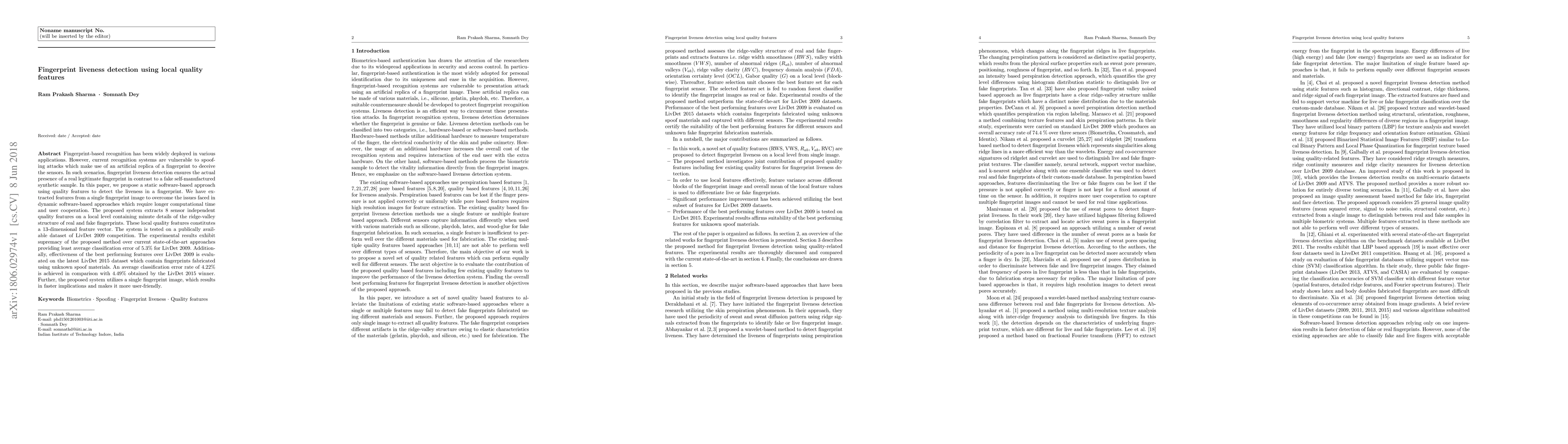 This paper proposes a static software-based liveness detection method for fingerprints using local quality features extracted from a single image, achieving a 5.3% average classification error on the LivDet 2009 dataset and outperforming current state-of-the-art methods. The method also shows effectiveness on the LivDet 2015 dataset with a 4.22% error rate, demonstrating robustness against unknown spoof materials.