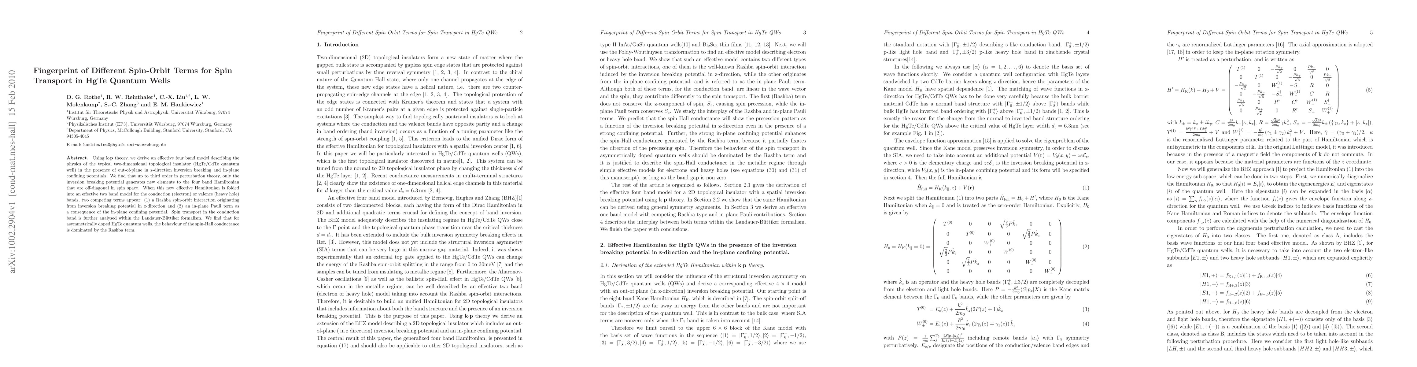 This paper uses $\vec{k}\cdot\vec{p}$ theory to develop an effective four-band model for HgTe/CdTe quantum wells, revealing that spin-orbit terms, including a Rashba interaction and an in-plane Pauli term, influence spin transport. The spin-Hall conductance is predominantly governed by the Rashba term in asymmetrically doped structures.