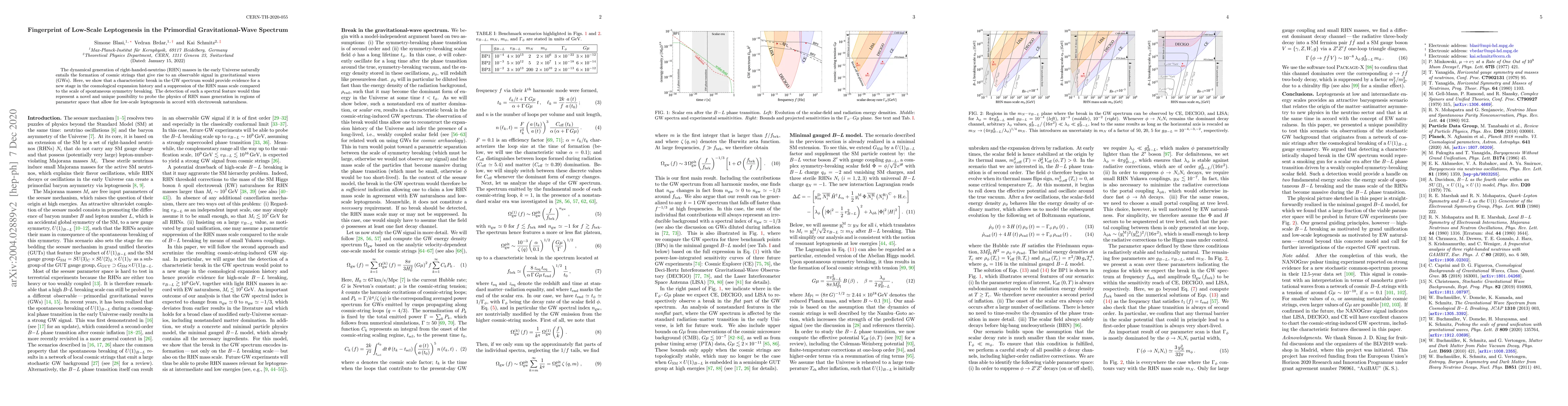 This paper explores how cosmic strings formed from the dynamical generation of right-handed-neutrino masses in the early Universe could leave a distinct signature in the primordial gravitational-wave spectrum. A characteristic break in the gravitational-wave spectrum would indicate low-scale leptogenesis, offering a unique probe into the physics of right-handed-neutrino mass generation.