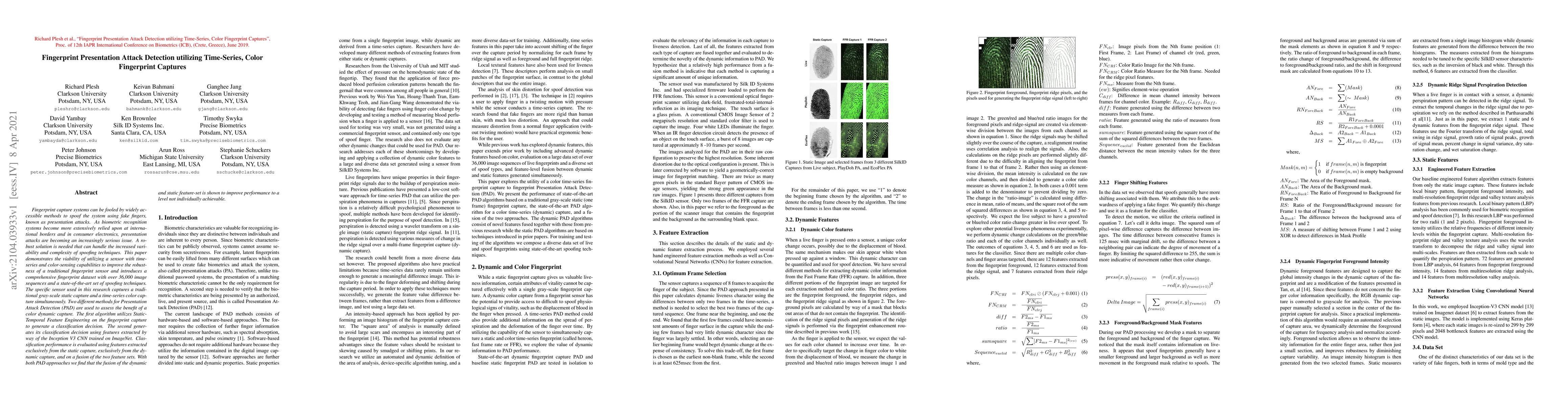 Fingerprint capture systems can be fooled by widely accessible methods to spoof the system using fake fingers, known as presentation attacks. As biometric recognition systems become more extensively relied upon at international borders and in consumer electronics, presentation attacks are becoming an increasingly serious issue. A robust solution is needed that can handle the increased variability and complexity of spoofing techniques. This paper demonstrates the viability of utilizing a sensor with time-series and color-sensing capabilities to improve the robustness of a traditional fingerprint sensor and introduces a comprehensive fingerprint dataset with over 36,000 image sequences and a state-of-the-art set of spoofing techniques. The specific sensor used in this research captures a traditional gray-scale static capture and a time-series color capture simultaneously. Two different methods for Presentation Attack Detection (PAD) are used to assess the benefit of a color dynamic capture. The first algorithm utilizes Static-Temporal Feature Engineering on the fingerprint capture to generate a classification decision. The second generates its classification decision using features extracted by way of the Inception V3 CNN trained on ImageNet. Classification performance is evaluated using features extracted exclusively from the static capture, exclusively from the dynamic capture, and on a fusion of the two feature sets. With both PAD approaches we find that the fusion of the dynamic and static feature-set is shown to improve performance to a level not individually achievable.