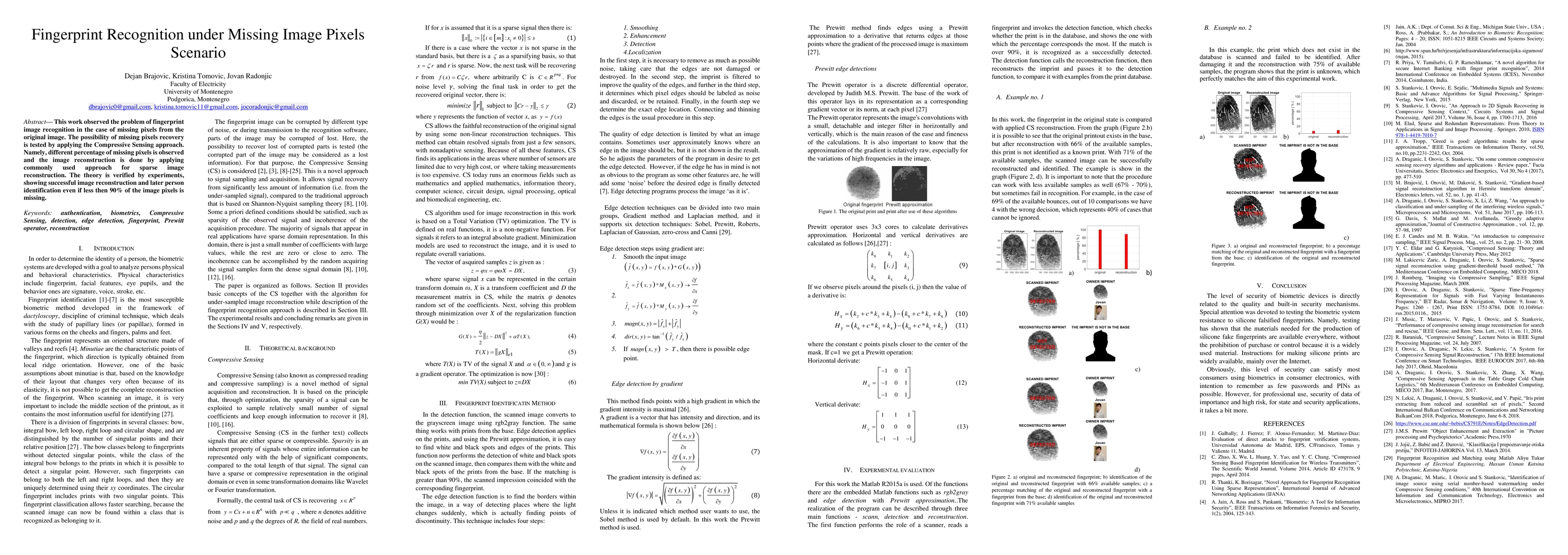 Researchers successfully recovered missing pixels in fingerprint images using Compressive Sensing, enabling person identification even with less than 90% of image pixels missing.