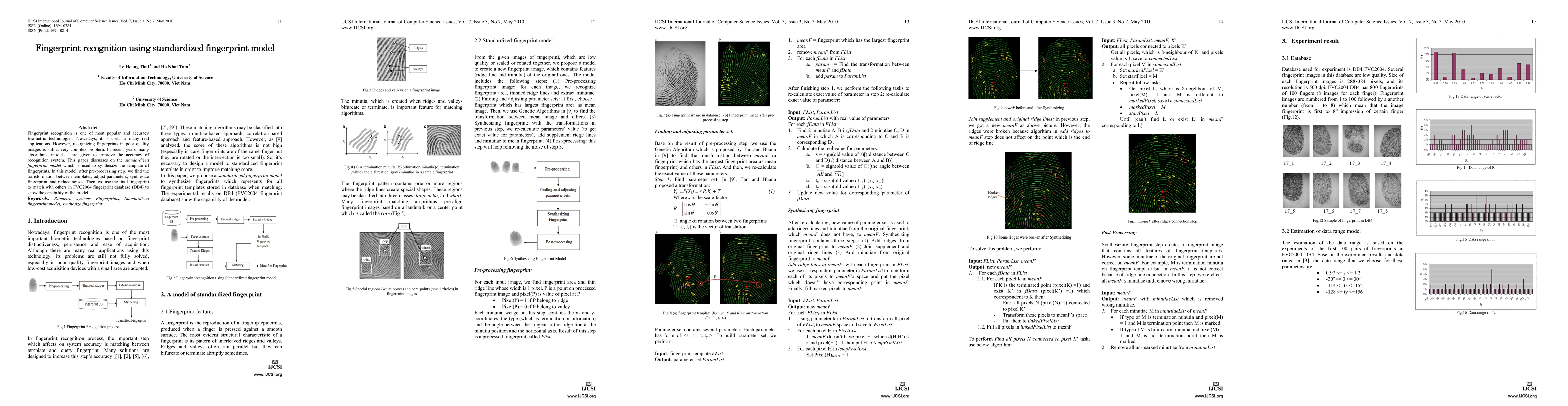 Fingerprint recognition is one of most popular and accuracy Biometric technologies. Nowadays, it is used in many real applications. However, recognizing fingerprints in poor quality images is still a very complex problem. In recent years, many algorithms, models...are given to improve the accuracy of recognition system. This paper discusses on the standardized fingerprint model which is used to synthesize the template of fingerprints. In this model, after pre-processing step, we find the transformation between templates, adjust parameters, synthesize fingerprint, and reduce noises. Then, we use the final fingerprint to match with others in FVC2004 fingerprint database (DB4) to show the capability of the model.
