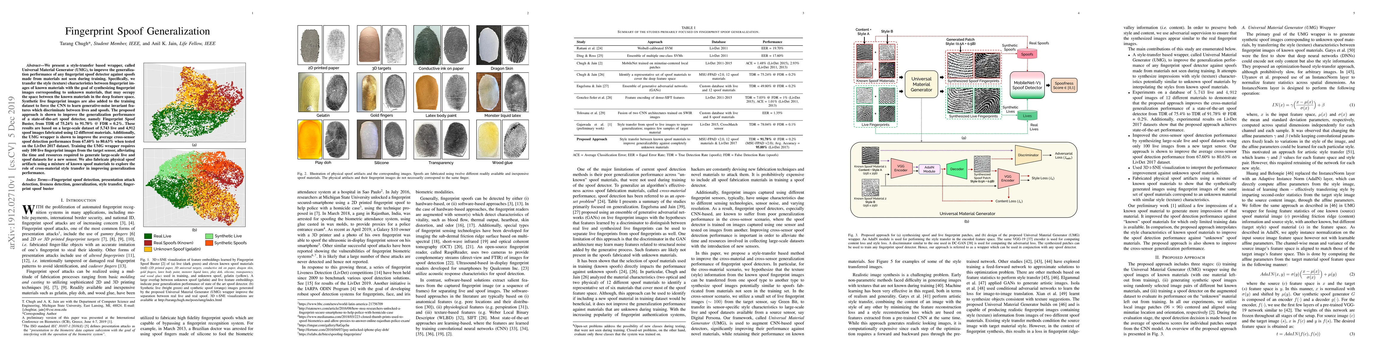 This research introduces a style-transfer based wrapper named Universal Material Generator (UMG) to enhance the generalization of fingerprint spoof detectors against unknown spoof materials. The UMG synthesizes fingerprint images of unseen materials and adds synthetic live images to the training set, improving the detector's performance significantly. The results demonstrate notable improvements in detection accuracy across various datasets. For more details, refer to the original paper.
