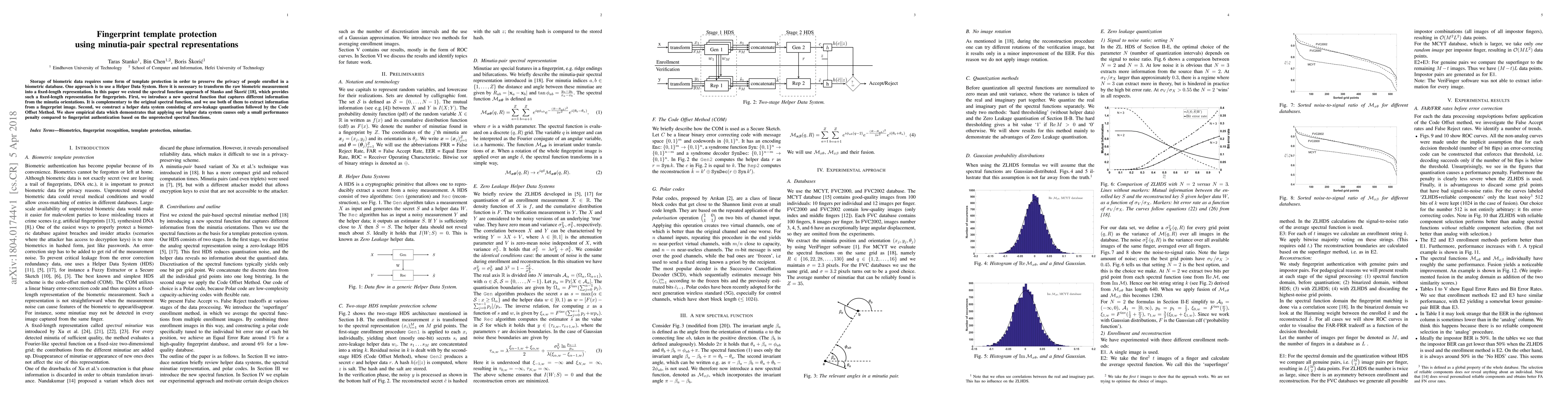Storage of biometric data requires some form of template protection in order to preserve the privacy of people enrolled in a biometric database. One approach is to use a Helper Data System. Here it is necessary to transform the raw biometric measurement into a fixed-length representation. In this paper we extend the spectral function approach of Stanko and Skoric [WIFS2017], which provides such a fixed-length representation for fingerprints. First, we introduce a new spectral function that captures different information from the minutia orientations. It is complementary to the original spectral function, and we use both of them to extract information from a fingerprint image. Second, we construct a helper data system consisting of zero-leakage quantisation followed by the Code Offset Method. We show empirical data which demonstrates that applying our helper data system causes only a small performance penalty compared to fingerprint authentication based on the unprotected spectral functions.