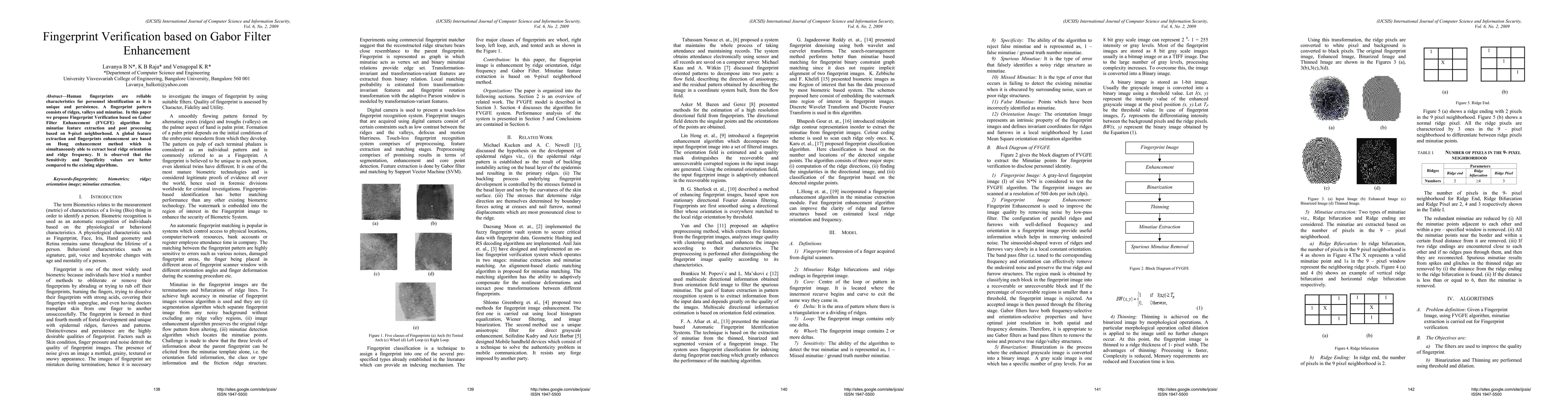 This paper proposes an FVGFE algorithm for fingerprint verification using Gabor filter enhancement for minutiae feature extraction, enhanced by the Hong enhancement method for ridge orientation and frequency. The proposed method shows improved sensitivity and specificity compared to existing algorithms.