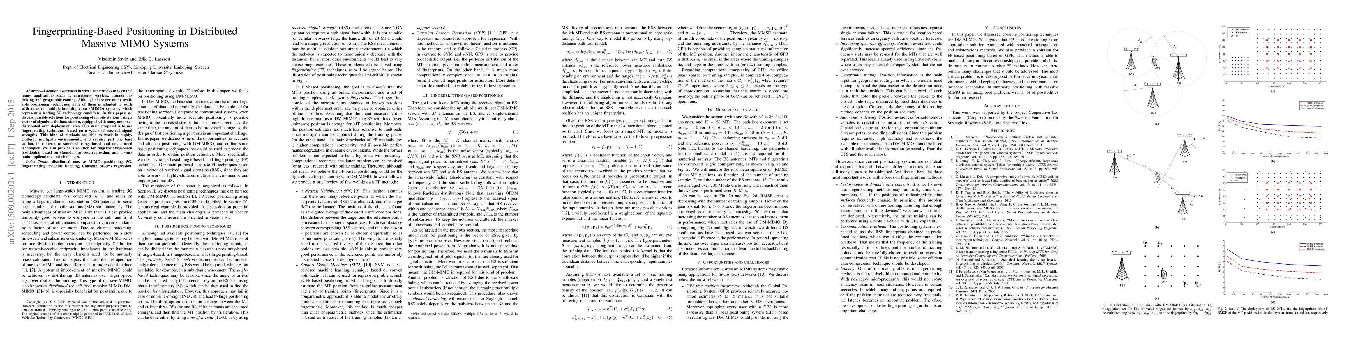 This paper explores fingerprinting-based positioning solutions for distributed massive MIMO systems in 5G networks, proposing a method using received signal strength vectors at a single base station. It addresses the challenges of multipath environments and compares it with standard range-based and angle-based techniques.