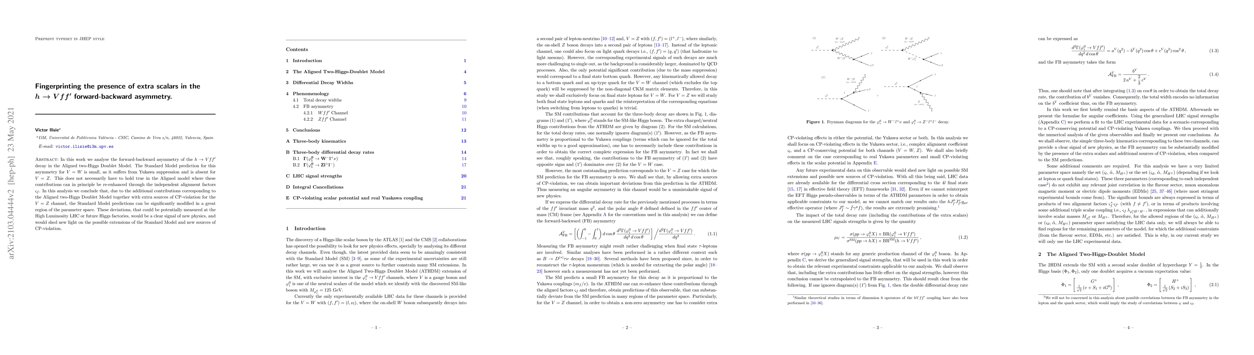 This paper investigates the forward-backward asymmetry in the $h\to Vff'$ decay within the Aligned two-Higgs Doublet Model, finding potential significant deviations from Standard Model predictions due to extra scalar contributions and CP-violation sources, which could signal new physics.