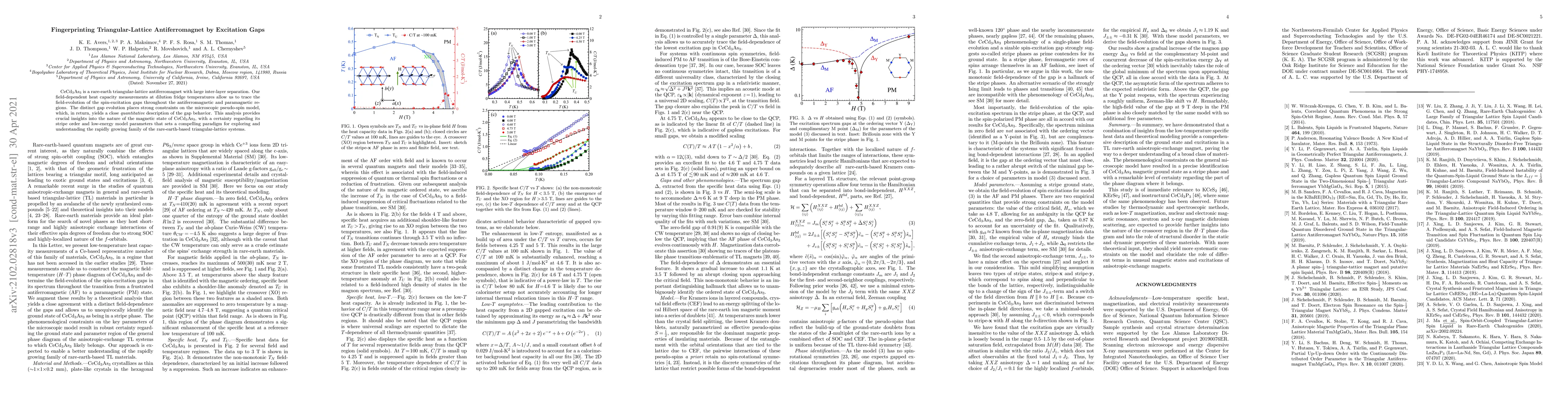 This paper investigates the magnetic state of CeCd$_3$As$_3$ using field-dependent heat capacity measurements to trace spin-excitation gaps, revealing a distinct gap evolution that constrains the pseudo-spin model and provides insights into its stripe order and low-energy parameters. The findings set a paradigm for understanding rare-earth triangular-lattice antiferromagnets.