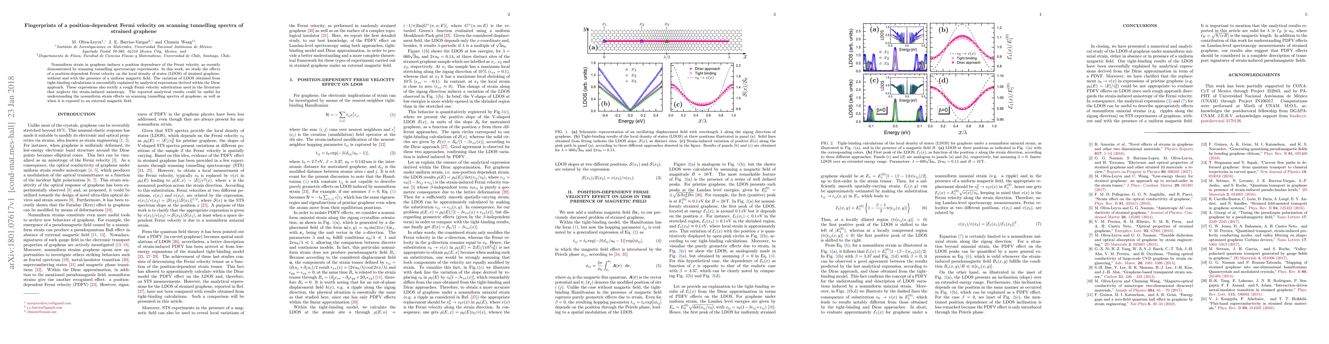 This paper investigates how nonuniform strain in graphene affects the local density of states (LDOS) via a position-dependent Fermi velocity, employing tight-binding calculations and Dirac approach. Analytical expressions derived from the Dirac model explain variations in LDOS, rectifying previous approximations, and provide insights into graphene's behavior under strain and magnetic fields.