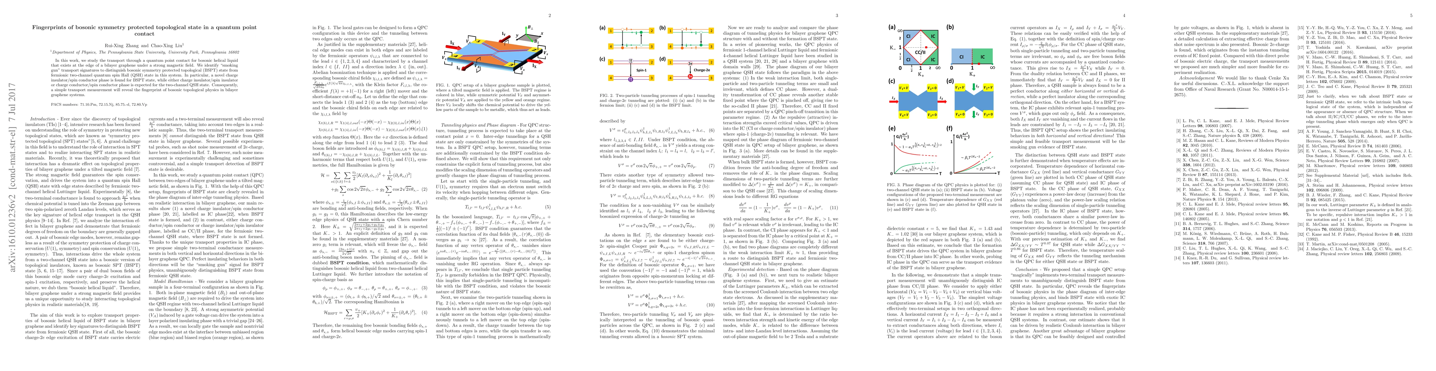 In this work, we study the transport through a quantum point contact for bosonic helical liquid that exists at the edge of a bilayer graphene under a strong magnetic field. We identify "smoking gun" transport signatures to distinguish bosonic symmetry protected topological (BSPT) state from fermionic two-channel quantum spin Hall (QSH) state in this system. In particular, a novel charge insulator/spin conductor phase is found for BSPT state, while either charge insulator/spin insulator or charge conductor/spin conductor phase is expected for the two-channel QSH state. Consequently, a simple transport measurement will reveal the fingerprint of bosonic topological physics in bilayer graphene systems.