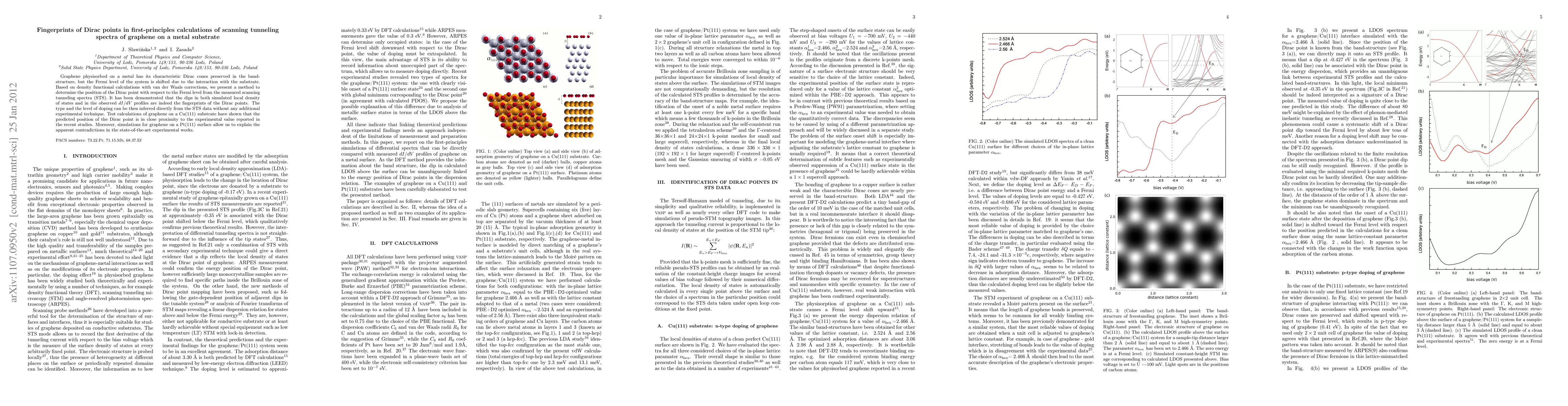 This paper presents a method to determine the position of Dirac points in graphene on metal substrates using scanning tunneling spectroscopy, showing that dips in the spectra are fingerprints of these points. The approach allows for the determination of doping type and level directly from the spectra, validated through calculations on graphene on Cu(111) and Pt(111) surfaces.