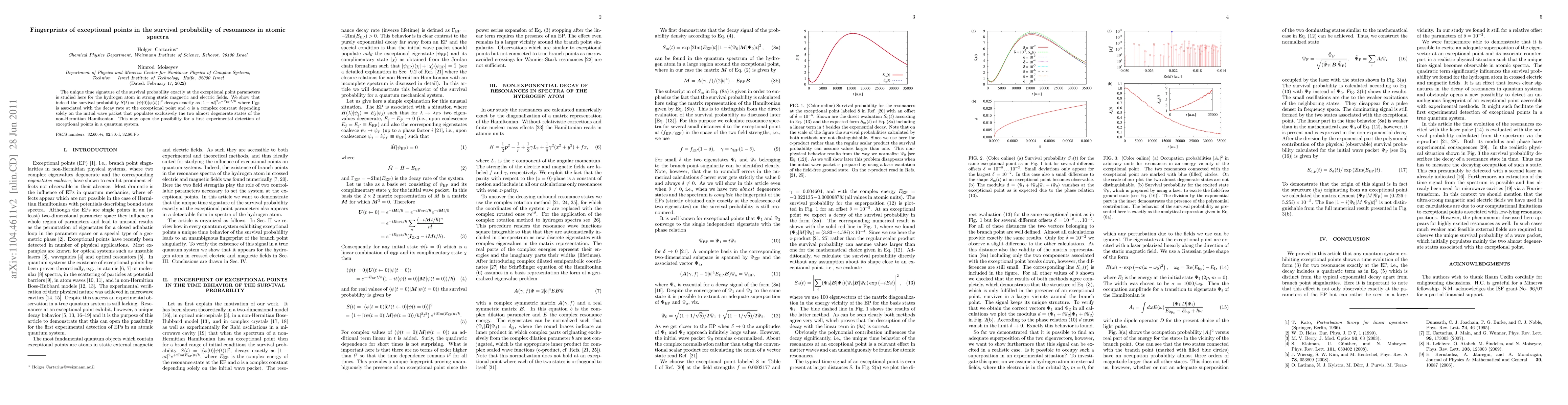 This paper analyzes the survival probability of resonances in atomic spectra under strong magnetic and electric fields, revealing a unique decay pattern that may enable experimental detection of exceptional points in quantum systems.