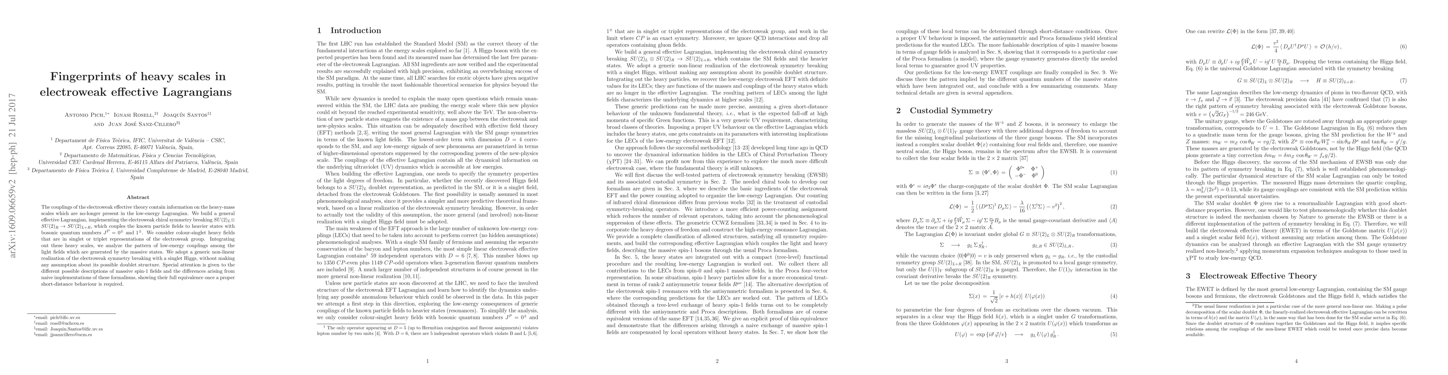 The couplings of the electroweak effective theory contain information on the heavy-mass scales which are no-longer present in the low-energy Lagrangian. We build a general effective Lagrangian, implementing the electroweak chiral symmetry breaking $SU(2)_L\otimes SU(2)_R\to SU(2)_{L+R}$, which couples the known particle fields to heavier states with bosonic quantum numbers $J^P=0^\pm$ and $1^\pm$. We consider colour-singlet heavy fields that are in singlet or triplet representations of the electroweak group. Integrating out these heavy scales, we analyze the pattern of low-energy couplings among the light fields which are generated by the massive states. We adopt a generic non-linear realization of the electroweak symmetry breaking with a singlet Higgs, without making any assumption about its possible doublet structure. Special attention is given to the different possible descriptions of massive spin-1 fields and the differences arising from naive implementations of these formalisms, showing their full equivalence once a proper short-distance behaviour is required.