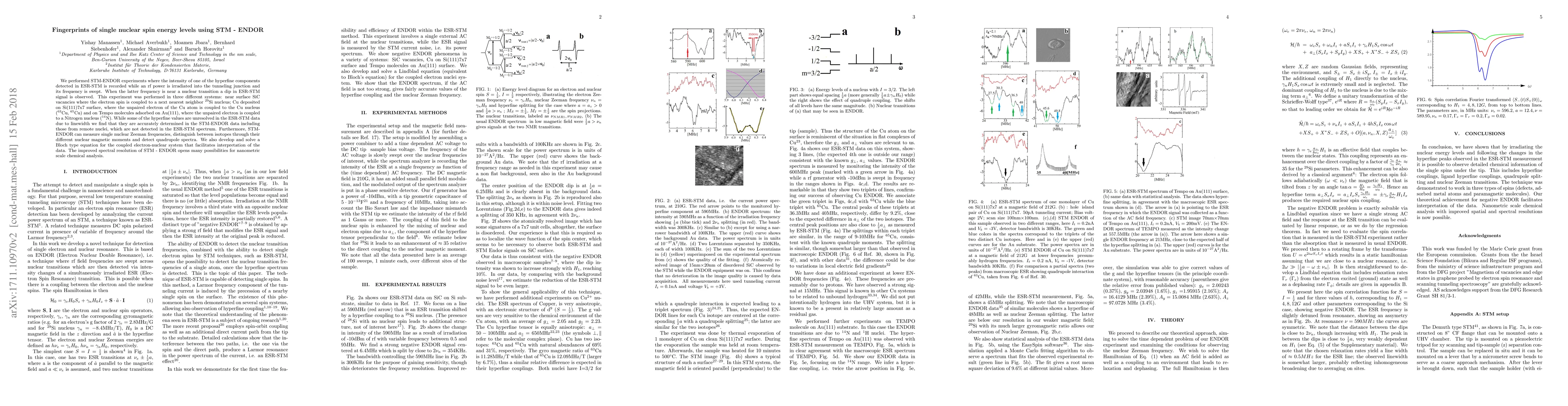 We performed STM-ENDOR experiments where the intensity of one of the hyperfine components detected in ESR-STM is recorded while an rf power is irradiated into the tunneling junction and its frequency is swept. When the latter frequency is near a nuclear transition a dip in ESR-STM signal is observed. This experiment was performed in three different systems: near surface SiC vacancies where the electron spin is coupled to a next nearest neighbor 29Si nucleus; Cu deposited on Si(111)7x7 surface, where the unpaired electron of the Cu atom is coupled to the Cu nucleus (63Cu, 65Cu) and on Tempo molecules adsorbed on Au(111), where the unpaired electron is coupled to Nitrogen nucleus (14N). While some of the hyperfine values are unresolved in the ESR-STM data due to linewidth we find that they are accurately determined in the STM-ENDOR data including those from remote nuclei, which are not detected in the ESR-STM spectrum. Furthermore, STM-ENDOR can measure single nuclear Zeeman frequencies, distinguish between isotopes through their different nuclear magnetic moments and detect quadrupole spectra. We also develop and solve a Bloch type equation for the coupled electron-nuclear system that facilitates interpretation of the data. The improved spectral resolution of STM - ENDOR opens many possibilities for nanometric scale chemical analysis.