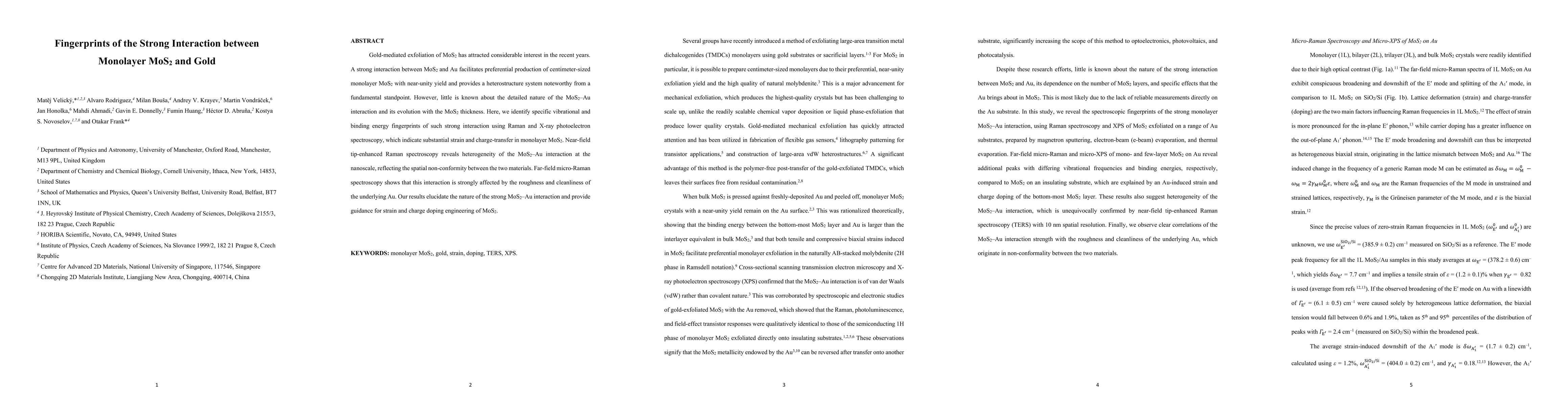Gold-mediated exfoliation of MoS2 has attracted considerable interest in the recent years. A strong interaction between MoS2 and Au facilitates preferential production of centimeter-sized monolayer MoS2 with near-unity yield and provides a heterostructure system noteworthy from a fundamental standpoint. However, little is known about the detailed nature of the MoS2-Au interaction and its evolution with the MoS2 thickness. Here, we identify specific vibrational and binding energy fingerprints of such strong interaction using Raman and X-ray photoelectron spectroscopy, which indicate substantial strain and charge-transfer in monolayer MoS2. Near-field tip-enhanced Raman spectroscopy reveals heterogeneity of the MoS2-Au interaction at the nanoscale, reflecting the spatial non-conformity between the two materials. Far-field micro-Raman spectroscopy shows that this interaction is strongly affected by the roughness and cleanliness of the underlying Au. Our results elucidate the nature of the strong MoS2-Au interaction and provide guidance for strain and charge doping engineering of MoS2.