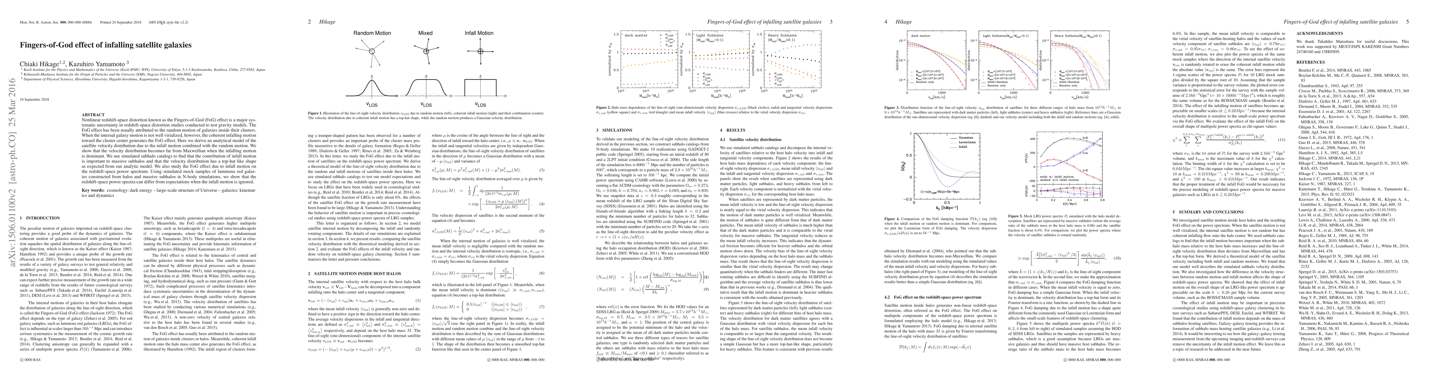 This paper investigates the Fingers-of-God effect caused by the coherent infalling motion of satellite galaxies in clusters, showing that this motion significantly alters the satellite velocity distribution and impacts the redshift-space power spectrum. The study finds that the infall motion must be considered to accurately model the effect and improve the accuracy of gravity model tests.