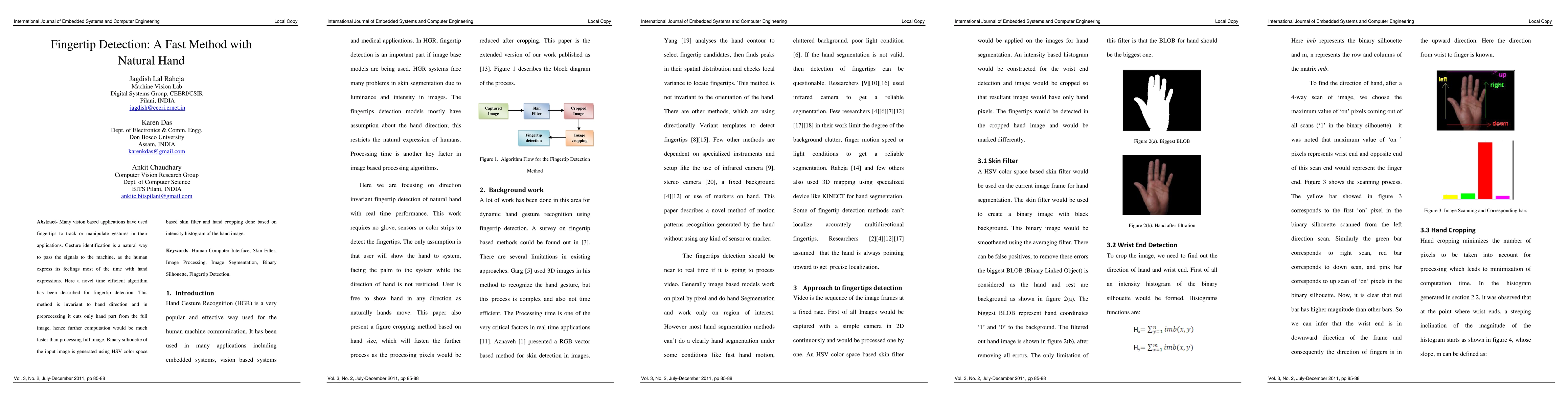 This paper presents a fast, time-efficient algorithm for fingertip detection, invariant to hand direction, which first isolates the hand from the full image, significantly speeding up computation. The method uses an HSV color space skin filter and intensity histogram to generate a binary silhouette for precise fingertip identification.