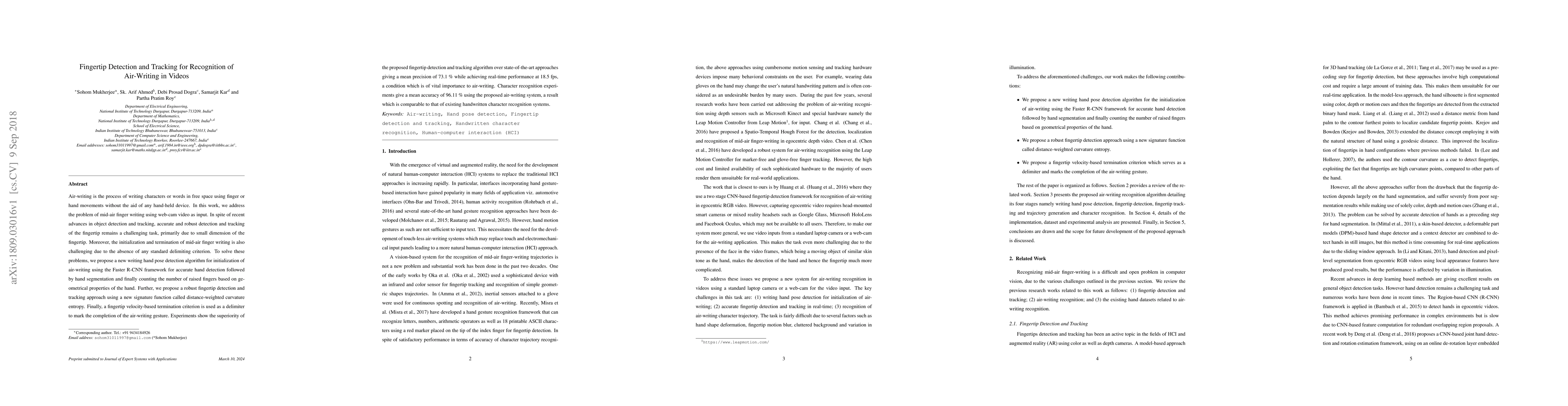 This paper proposes a method for detecting and tracking fingertips to recognize air-writing using webcam video, addressing challenges due to fingertip size and lack of delimiting criteria. The approach uses Faster R-CNN for hand detection, followed by finger segmentation and tracking via distance-weighted curvature entropy, achieving 73.1% precision and 96.11% character recognition accuracy.