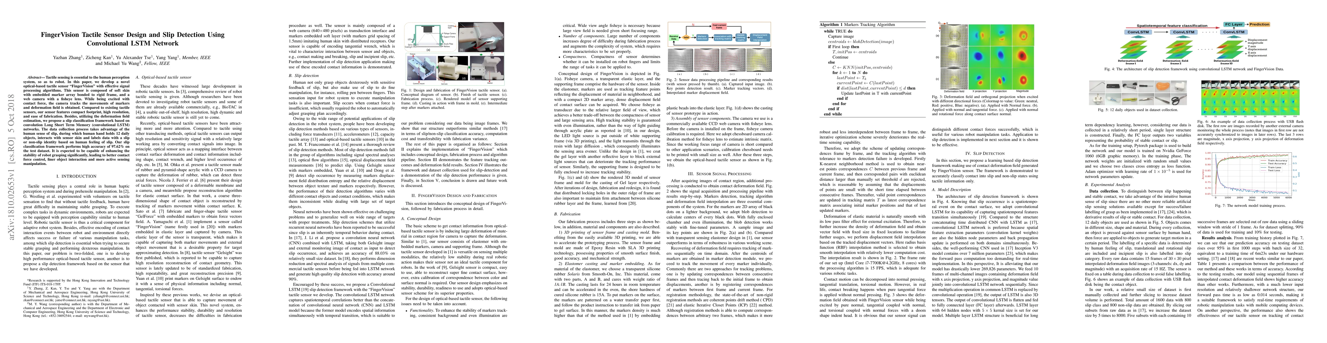 This paper introduces "FingerVision," an optical-based tactile sensor with embedded markers and a fisheye lens camera for tracking deformations. It employs a convolutional LSTM network for slip detection, achieving 97.62% accuracy, aiming to enhance robot grasping stability and object interaction.