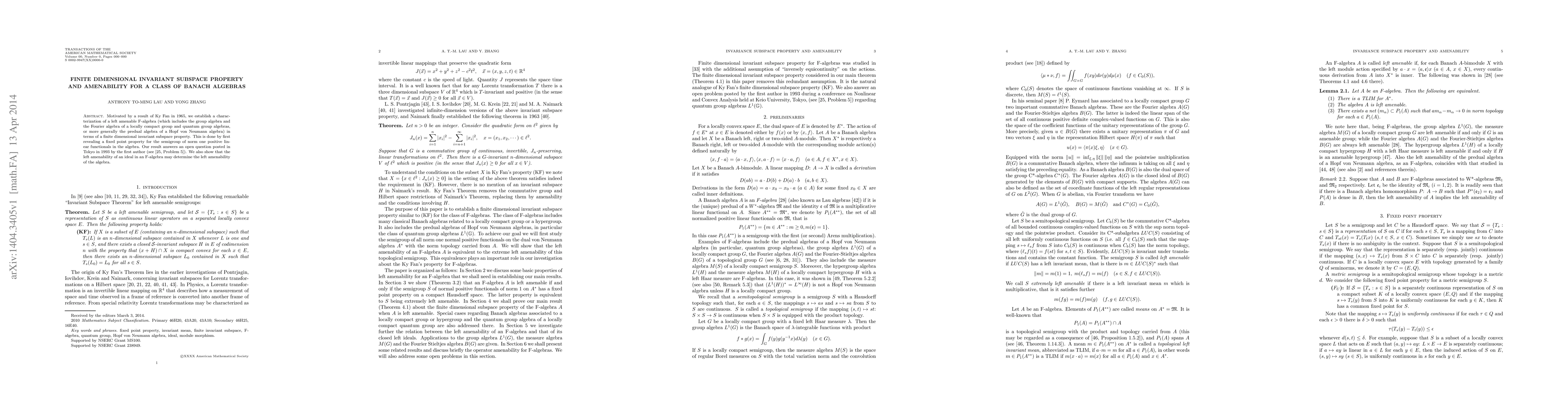 Motivated by a result of Ky Fan in 1965, we establish a characterization of a left amenable F-algebra (which includes the group algebra and the Fourier algebra of a locally compact group and quantum group algebras, or more generally the predual algebra of a Hopf von Neumann algebra) in terms of a finite dimensional invariant subspace property. This is done by first revealing a fixed point property for the semigroup of norm one positive linear func- tionals in the algebra. Our result answers an open question posted in Tokyo in 1993 by the first author (see [25, Problem 5]). We also show that the left amenability of an ideal in an F-algebra may determine the left amenability of the algebra.
