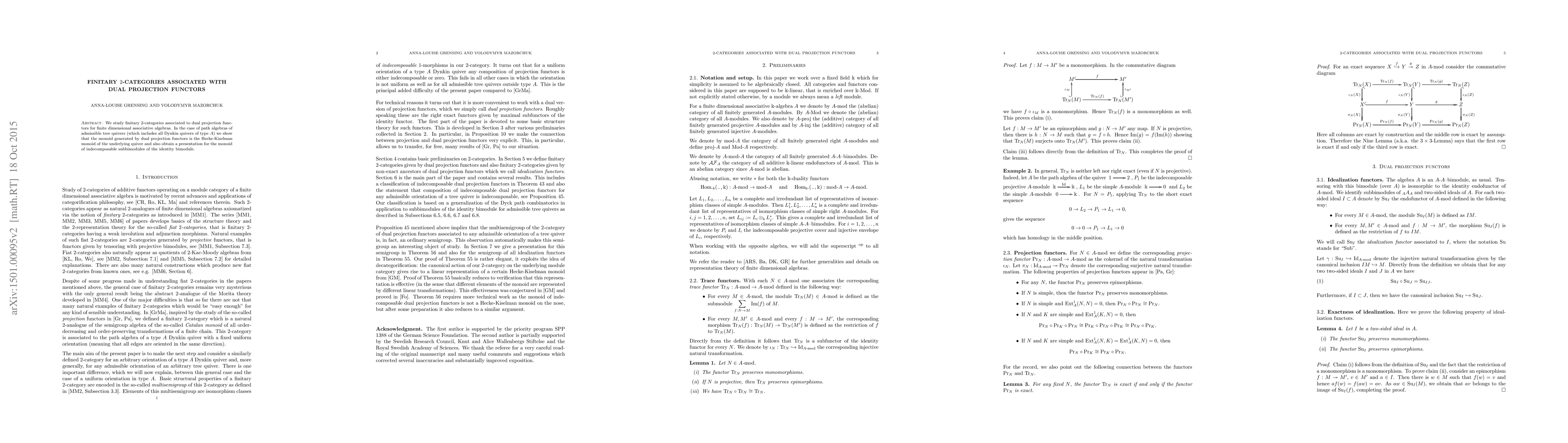 This paper explores finitary 2-categories linked to dual projection functors for finite-dimensional associative algebras, particularly focusing on path algebras of admissible tree quivers. It reveals that the monoid generated by these functors corresponds to the Hecke-Kiselman monoid of the underlying quiver and provides a presentation for the monoid of indecomposable subbimodules of the identity bimodule.