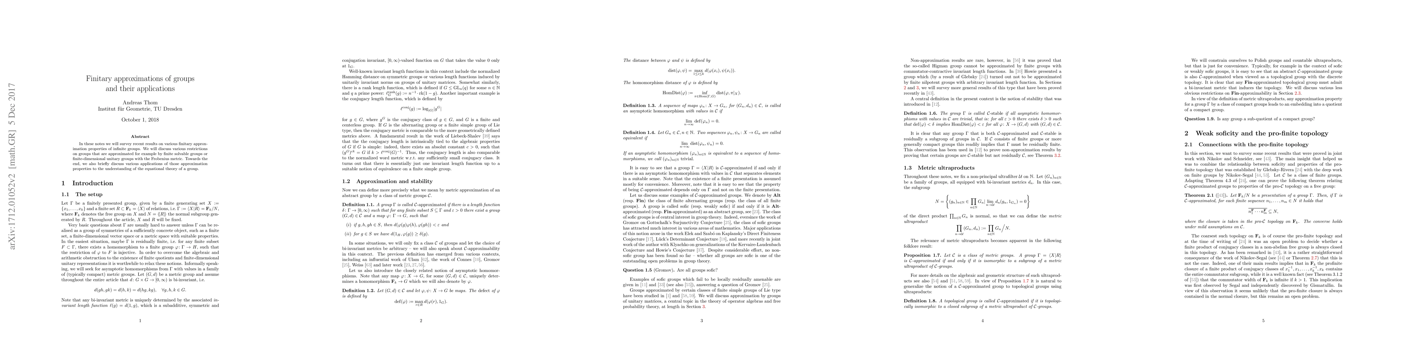 In these notes we will survey recent results on various finitary approximation properties of infinite groups. We will discuss various restrictions on groups that are approximated for example by finite solvable groups or finite-dimensional unitary groups with the Frobenius metric. Towards the end, we also briefly discuss various applications of those approximation properties to the understanding of the equational theory of a group.