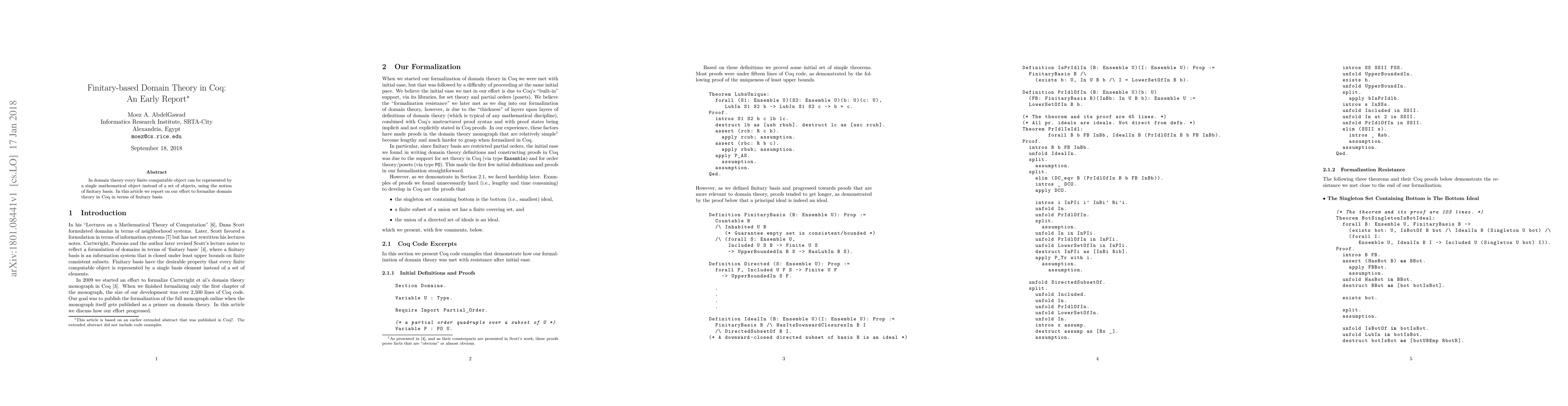 This paper reports on the formalization of domain theory in Coq, focusing on representing finite computable objects using finitary-basis instead of sets, leveraging the proof assistant's capabilities for rigorous mathematical proofs.