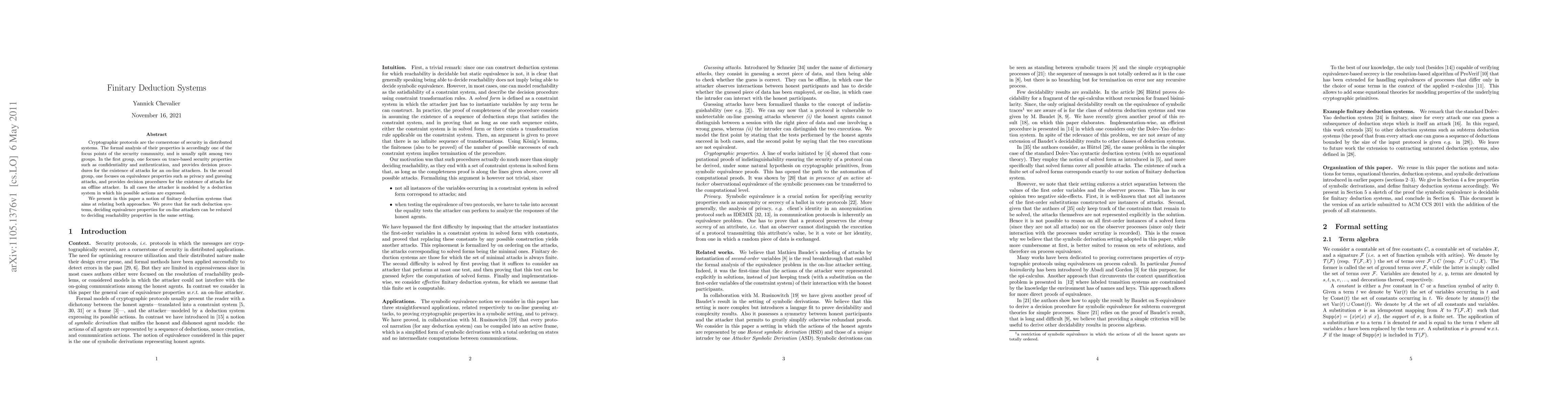 This paper introduces finitary deduction systems to bridge two approaches in cryptographic protocol analysis: trace-based security properties and equivalence properties. It shows that deciding equivalence properties for online attackers can be reduced to reaching reachability properties.