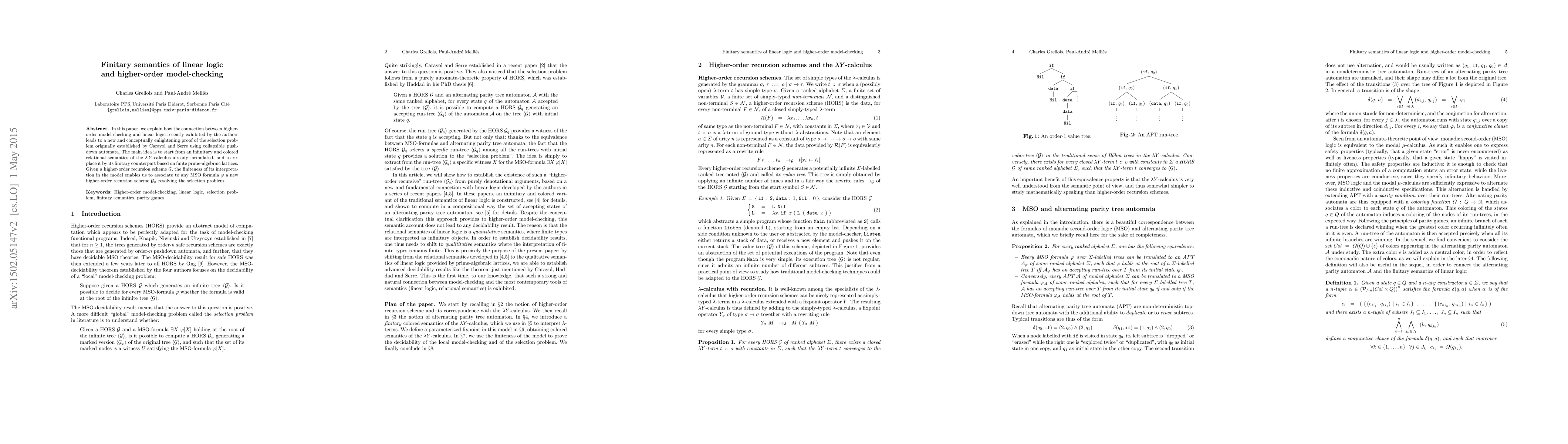 This paper connects higher-order model-checking with linear logic to resolve the selection problem using a finitary semantics based on finite prime-algebraic lattices, replacing an infinitary relational semantics of the lambdaY-calculus. The approach leads to a new recursion scheme G_phi for any MSO formula phi.