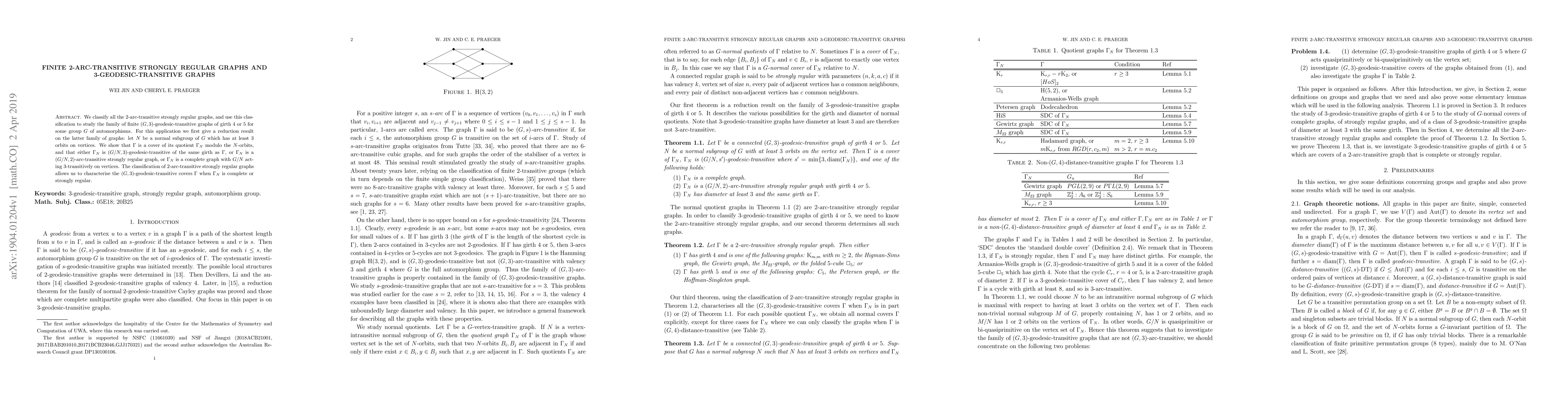 We classify all the $2$-arc-transitive strongly regular graphs, and use this classification to study the family of finite $(G,3)$-geodesic-transitive graphs of girth $4$ or $5$ for some group $G$ of automorphisms. For this application we first give a reduction result on the latter family of graphs: let $N$ be a normal subgroup of $G$ which has at least $3$ orbits on vertices. We show that $\Gamma$ is a cover of its quotient $\Gamma_N$ modulo the $N$-orbits, and that either $\Gamma_N$ is $(G/N,3)$-geodesic-transitive of the same girth as $\Gamma$, or $\Gamma_N$ is a $(G/N,2)$-arc-transitive strongly regular graph, or $\Gamma_N$ is a complete graph with $G/N$ acting 3-transitively on vertices. The classification of $2$-arc-transitive strongly regular graphs allows us to characterise the $(G,3)$-geodesic-transitive covers $\Gamma$ when $\Gamma_N$ is complete or strongly regular.