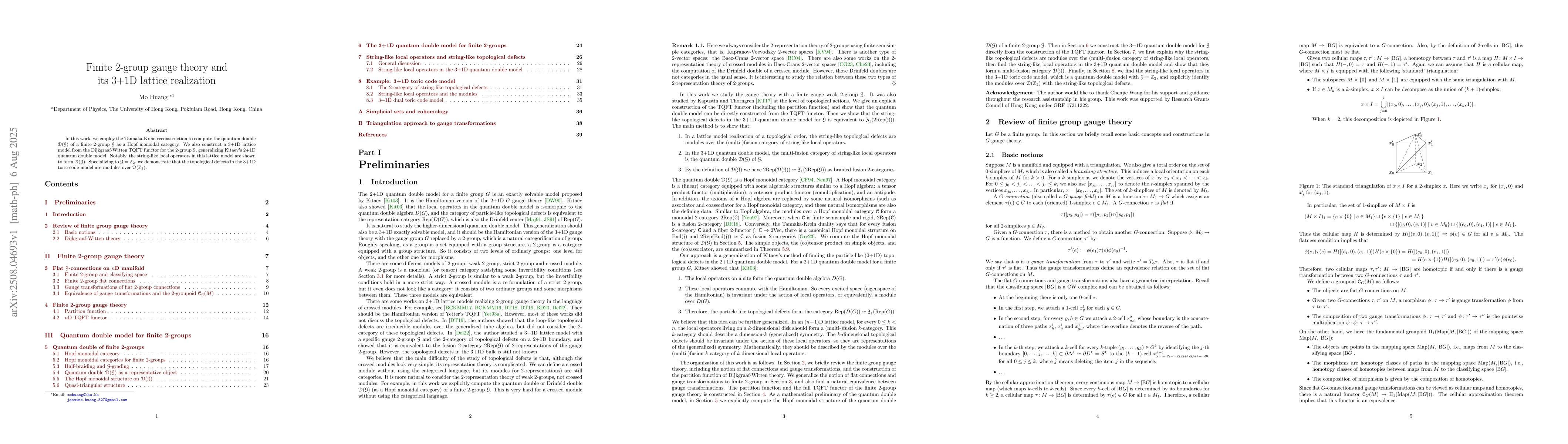 In this work, we employ the Tannaka-Krein reconstruction to compute the quantum double $\mathcal D(\mathcal G)$ of a finite 2-group $\mathcal G$ as a Hopf monoidal category. We also construct a 3+1D lattice model from the Dijkgraaf-Witten TQFT functor for the 2-group $\mathcal G$, generalizing Kitaev's 2+1D quantum double model. Notably, the string-like local operators in this lattice model are shown to form $\mathcal D(\mathcal G)$. Specializing to $\mathcal G = \mathbb{Z}_2$, we demonstrate that the topological defects in the 3+1D toric code model are modules over $\mathcal D(\mathbb{Z}_2)$.
