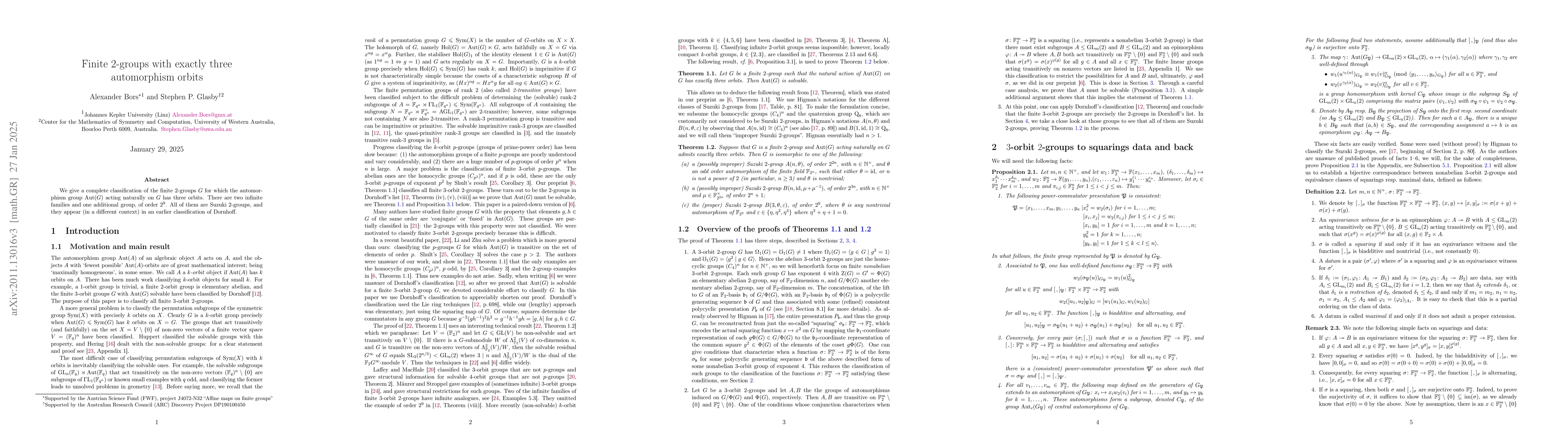 The paper classifies finite $2$-groups with exactly three automorphism orbits, revealing two infinite families and one unique group of order $2^9$; all are Suzuki $2$-groups identified in Dornhoff's prior classification.