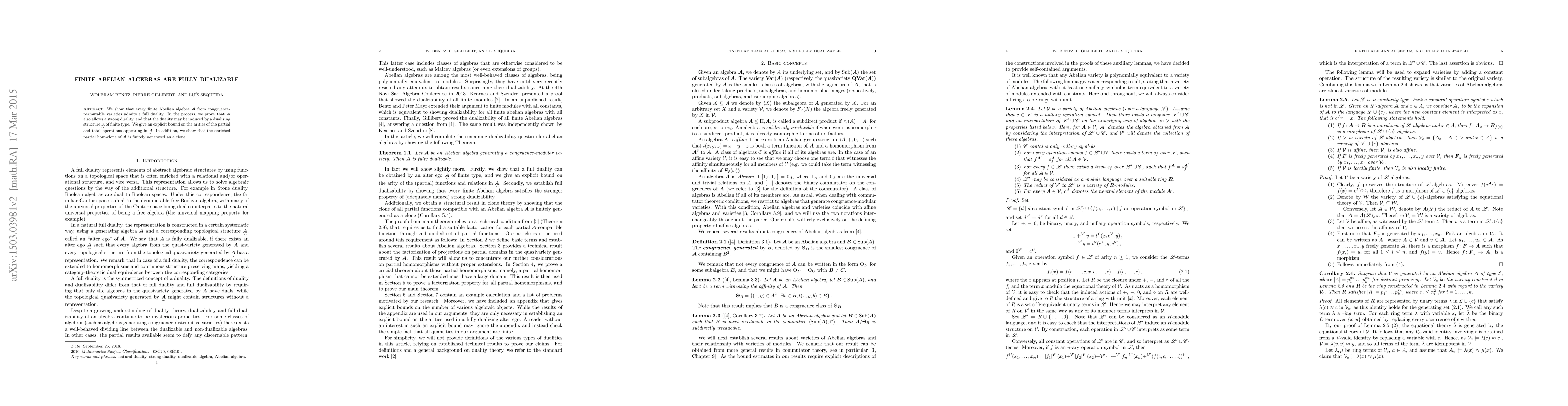 We show that every finite Abelian algebra A from congruence-permutable varieties admits a full duality. In the process, we prove that A also allows a strong duality, and that the duality may be induced by a dualizing structure of finite type. We give an explicit bound on the arities of the partial and total operations appearing in the dualizing structure. In addition, we show that the enriched partial hom-clone of A is finitely generated as a clone.