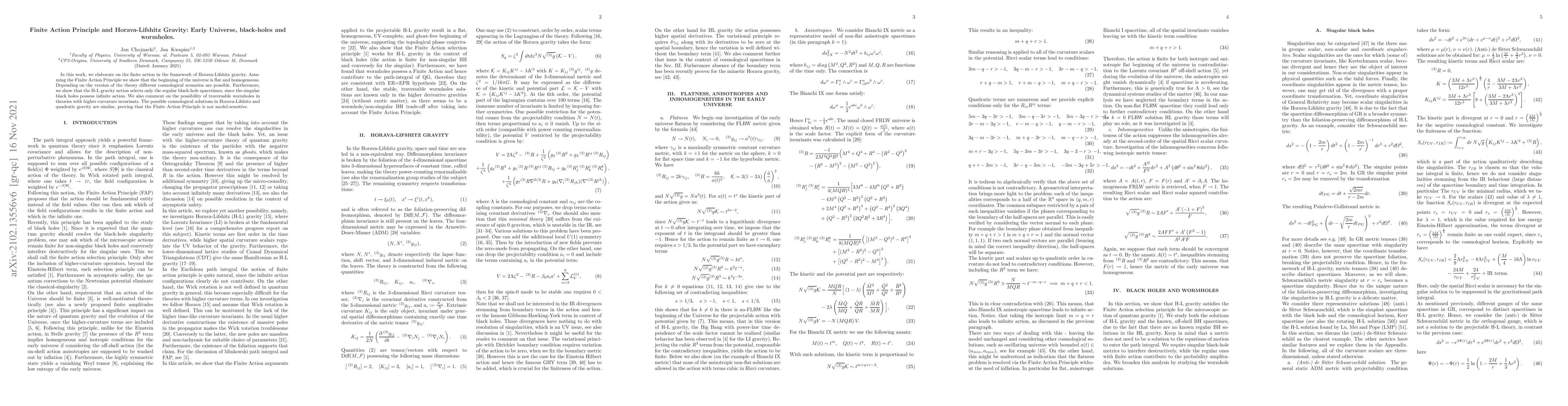 This paper explores the finite action principle within Horava-Lifshitz gravity to resolve black hole singularities and describe an isotropic early universe without inflation. It demonstrates that the H-L gravity framework selects regular black hole solutions and discusses the potential for traversable wormholes.