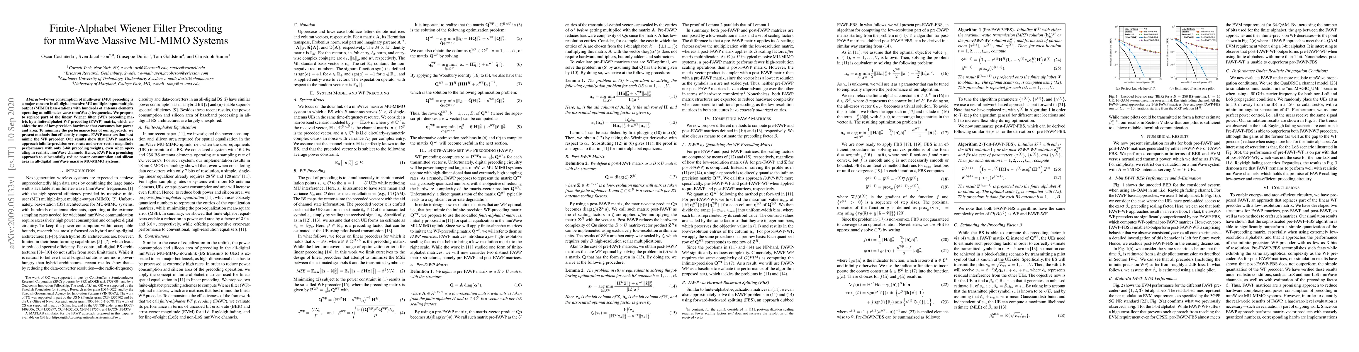 This paper proposes a finite-alphabet Wiener filter precoding method to reduce power consumption in mmWave massive MU-MIMO systems. By using low-precision hardware, the approach maintains near-optimal performance with minimal performance loss.