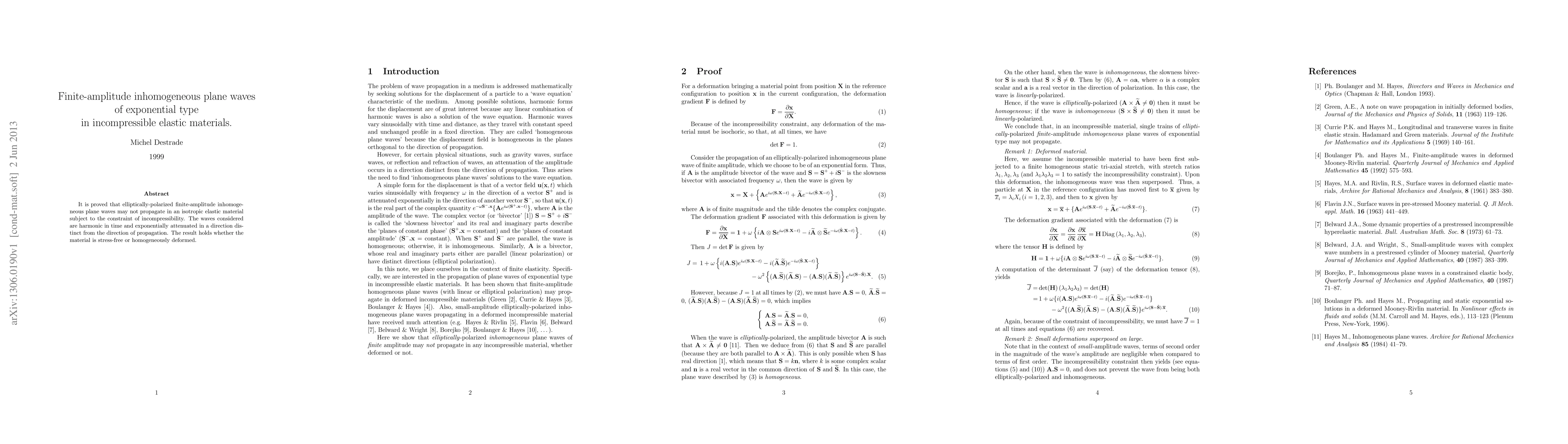 Summary: Research demonstrates that elliptically-polarized finite-amplitude inhomogeneous plane waves of exponential type cannot propagate in incompressible isotropic elastic materials. These waves are harmonic in time and attenuated in a direction different from their propagation.