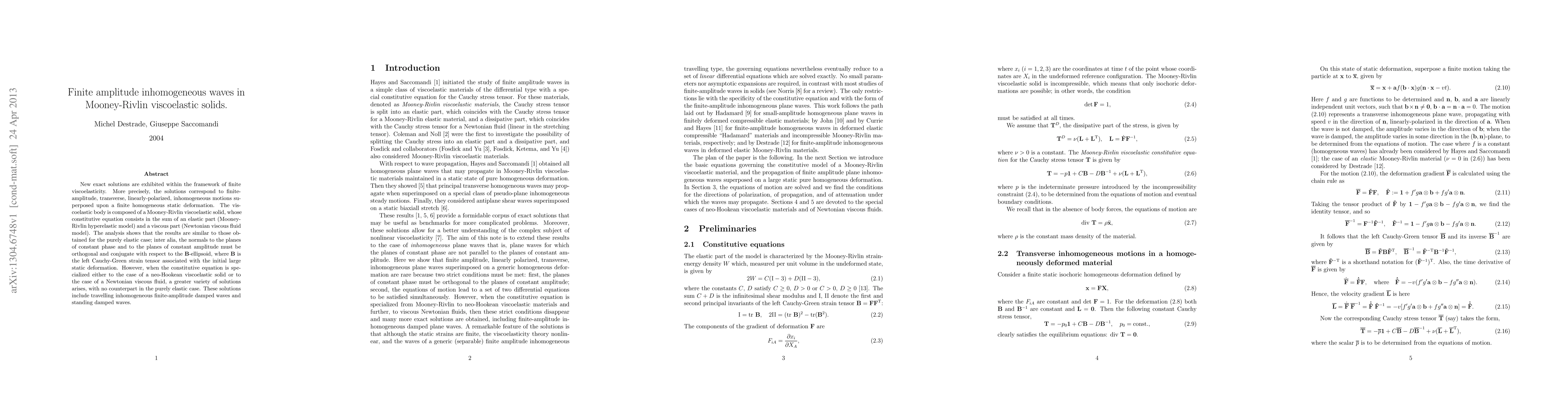 New exact solutions are exhibited within the framework of finite viscoelasticity. More precisely, the solutions correspond to finite-amplitude, transverse, linearly-polarized, inhomogeneous motions superposed upon a finite homogeneous static deformation. The viscoelastic body is composed of a Mooney-Rivlin viscoelastic solid, whose constitutive equation consists in the sum of an elastic part (Mooney-Rivlin hyperelastic model) and a viscous part (Newtonian viscous fluid model). The analysis shows that the results are similar to those obtained for the purely elastic case; inter alia, the normals to the planes of constant phase and to the planes of constant amplitude must be orthogonal and conjugate with respect to the B-ellipsoid, where B is the left Cauchy-Green strain tensor associated with the initial large static deformation. However, when the constitutive equation is specialized either to the case of a neo-Hookean viscoelastic solid or to the case of a Newtonian viscous fluid, a greater variety of solutions arises, with no counterpart in the purely elastic case. These solutions include travelling inhomogeneous finite-amplitude damped waves and standing damped waves.