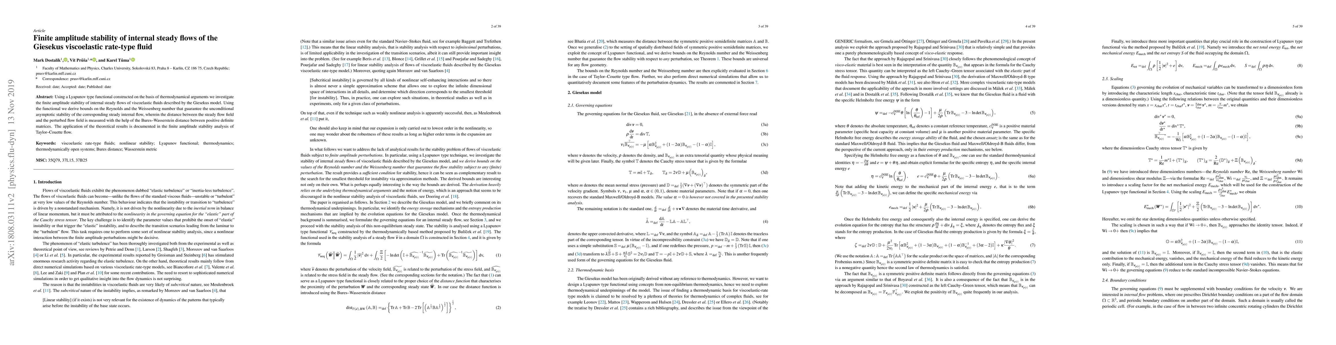 Using a Lyapunov type functional constructed on the basis of thermodynamical arguments we investigate the finite amplitude stability of internal steady flows of viscoelastic fluids described by the Giesekus model. Using the functional we derive bounds on the Reynolds and the Weissenberg number that guarantee the unconditional asymptotic stability of the corresponding steady internal flow, wherein the distance between the steady flow field and the perturbed flow field is measured with the help of the Bures--Wasserstein distance between positive definite matrices. The application of the theoretical results is documented in the finite amplitude stability analysis of Taylor--Couette flow.