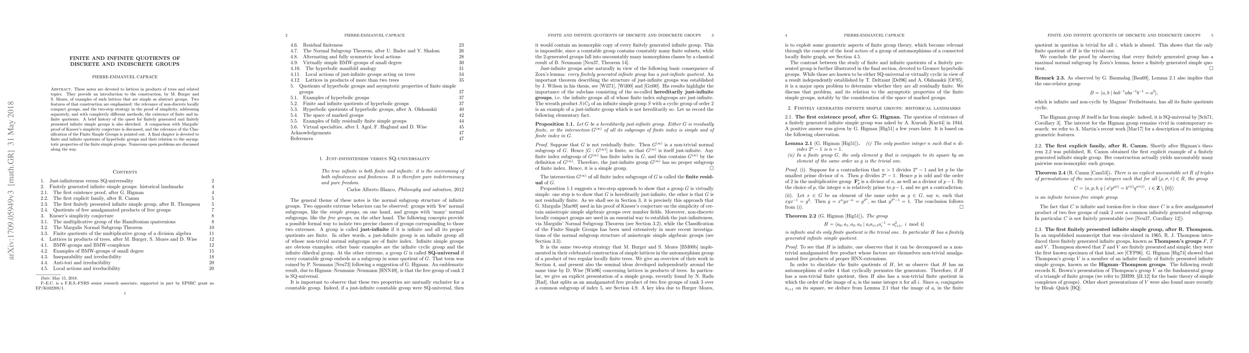 These notes are devoted to lattices in products of trees and related topics. They provide an introduction to the construction, by M. Burger and S. Mozes, of examples of such lattices that are simple as abstract groups. Two features of that construction are emphasized: the relevance of non-discrete locally compact groups, and the two-step strategy in the proof of simplicity, addressing separately, and with completely different methods, the existence of finite and infinite quotients. A brief history of the quest for finitely generated and finitely presented infinite simple groups is also sketched. A comparison with Margulis' proof of Kneser's simplicity conjecture is discussed, and the relevance of the Classification of the Finite Simple Groups is pointed out. A final chapter is devoted to finite and infinite quotients of hyperbolic groups and their relation to the asymptotic properties of the finite simple groups. Numerous open problems are discussed along the way.